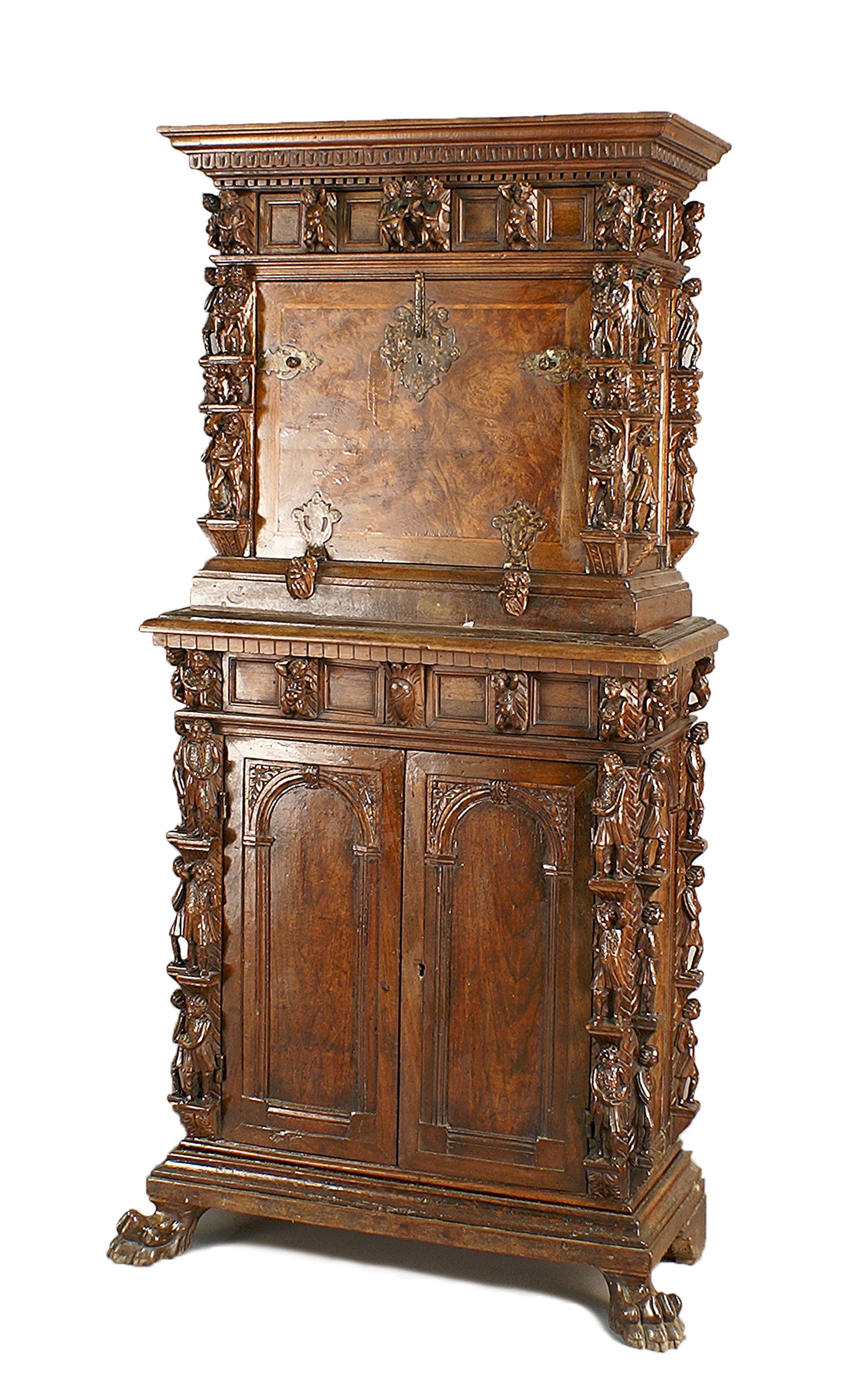 Stipo monetiere a "bambocci", in noce a due corpi, parte superiore con tre tiretti ad un'anta ribaltabile, parte inferiore a due cassetti e due sportelli sottostanti, vecchia manifattura, cm. 164x78x40.
