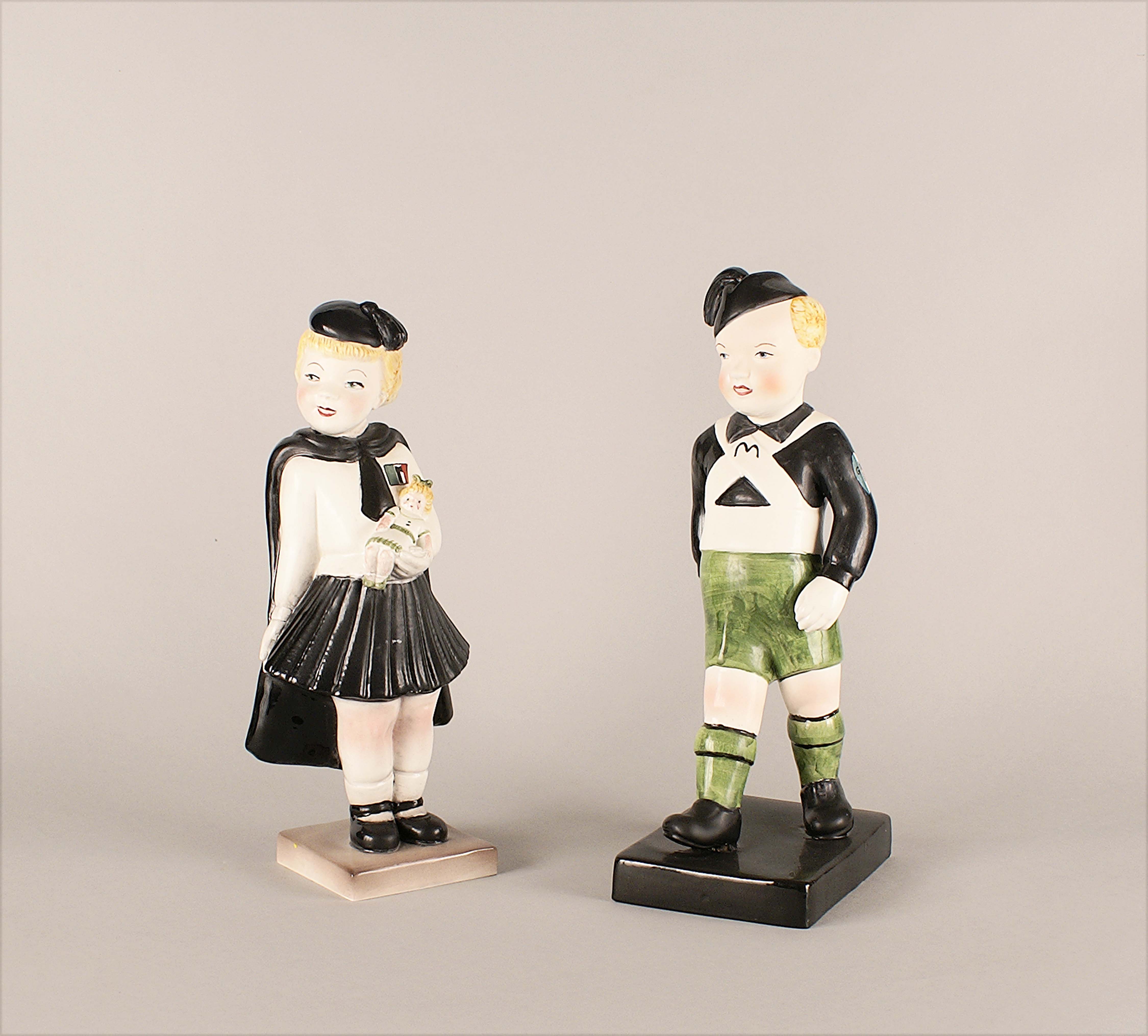 Coppia di balilla in ceramica policroma, vecchia manifattura Nove - Vicenza,...