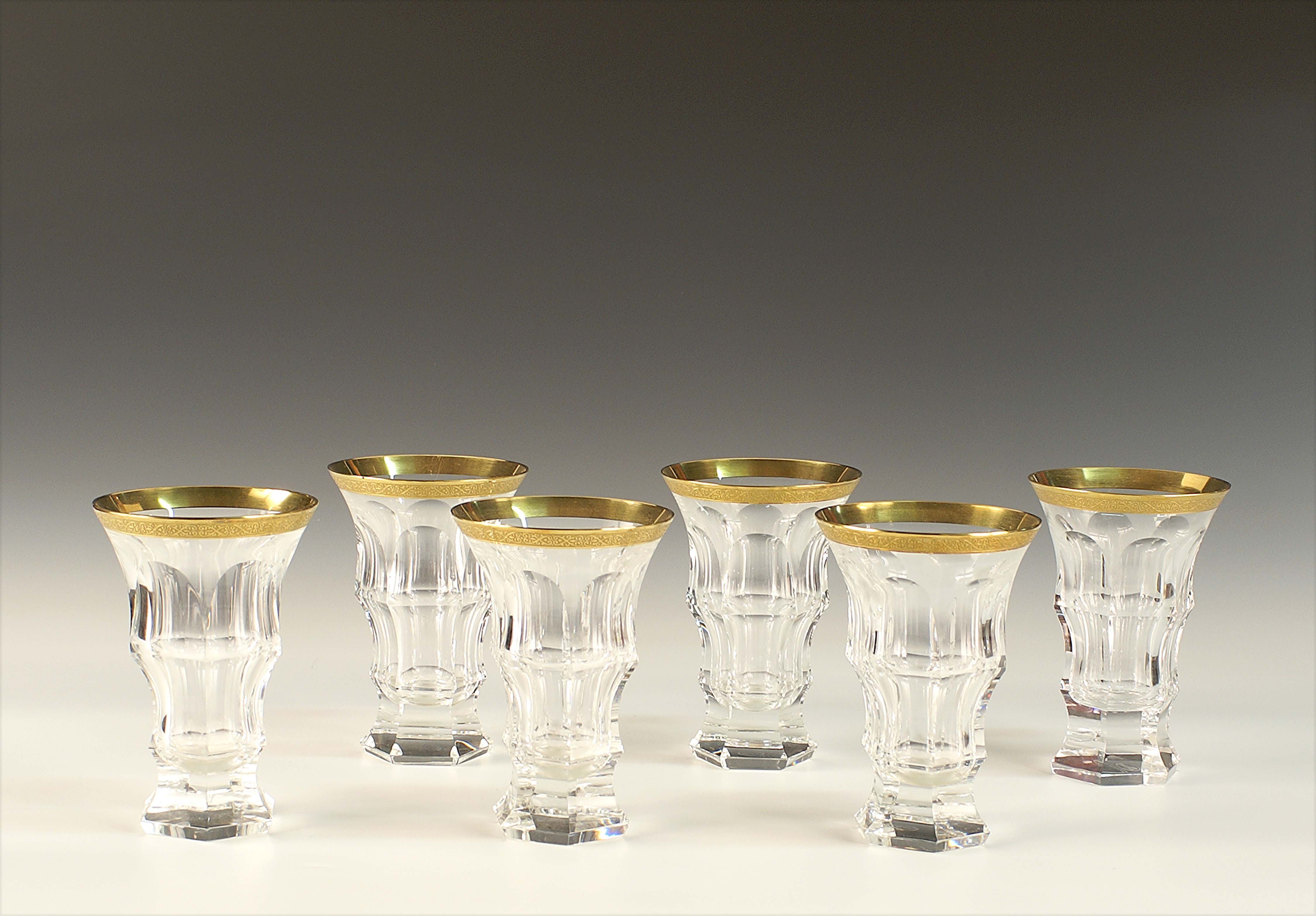 Sei bicchieri in cristallo molato con profilo dorato ed inciso.