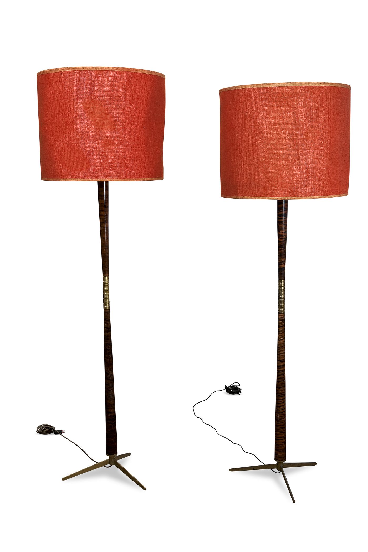 PIANTANE - Coppia di lampade a piantana in legno decorato a finto zebrano, piede e montatura in ottone, rispettivamente h cm 178 e 185