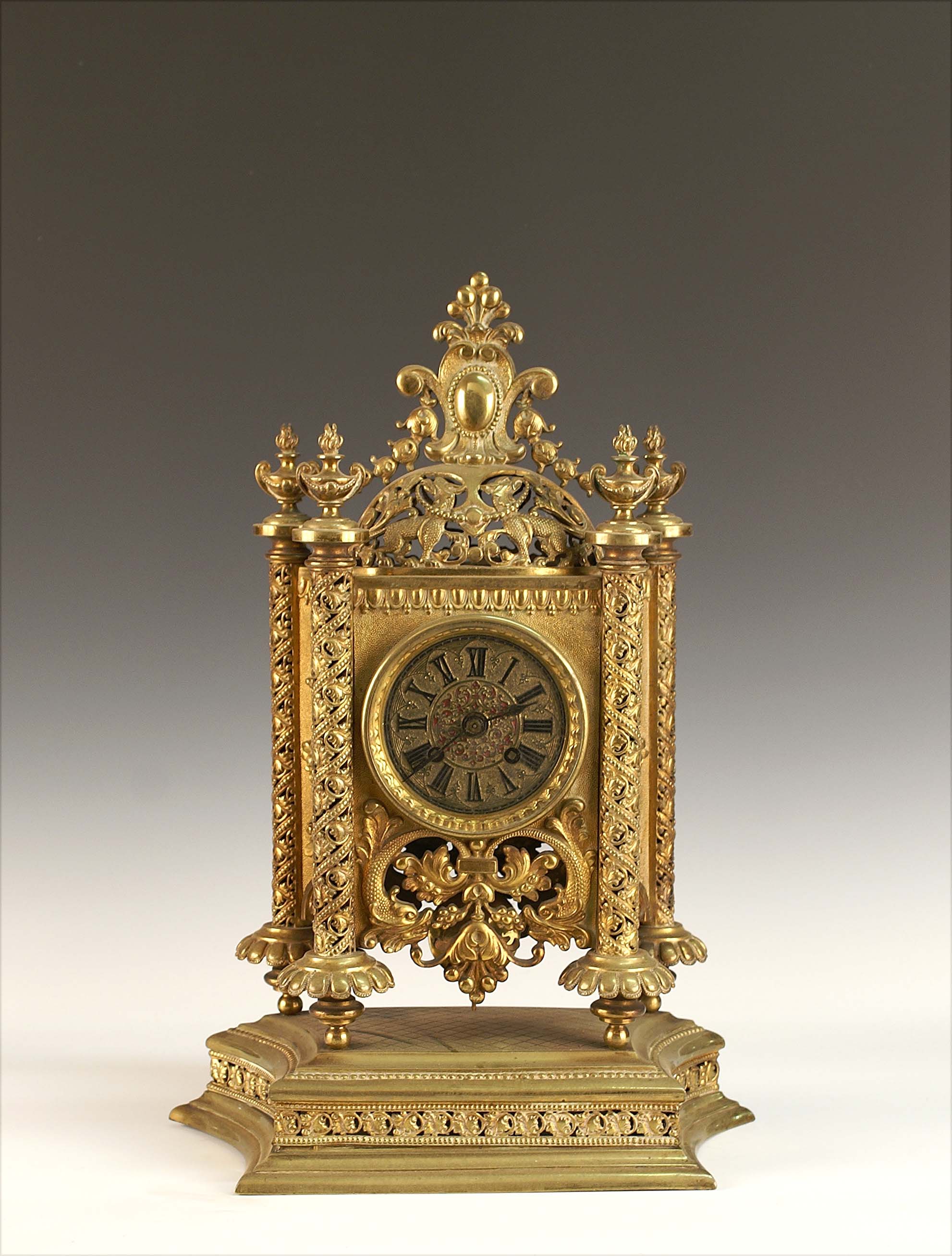 Pendola da camino in bronzo dorato di linea architettonica, quadrante...