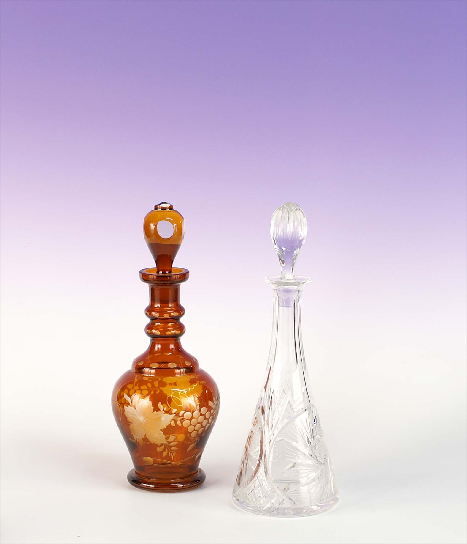 Lotto composto da una bottiglia in cristallo molato e da una bottiglia in vetro inciso, fogge e misure diverse.