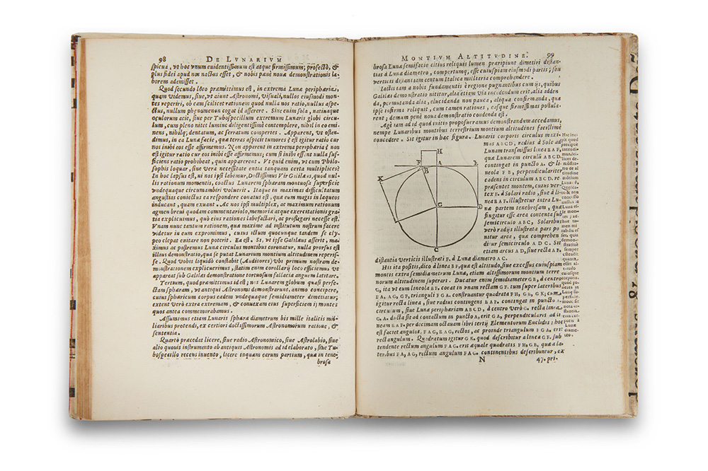 [GALILEI, Galileo (1564-1642)] -- GUIDUCCI, Mario (1584-1646). Lettera al M.R.P. Tarquinio Galluzzi della Compagnia di Giesu... Della quale si giustifica dell'imputazion dategli da Lottaro Sarsi Sigensano nella Libra Astronomica, e Filosofica. Bologna: presso gli HH. del Dozza, 1655. [Legato con:] Lettera del Sig. Galileo Galilei al Padre Christoforo Grienberger… in materia della Montuosità della Luna. Bologna: per gli HH. del Dozza, 1655. Seconda edizione dell'importante lettera di Guiducci e prima edizione di quella di Galileo sui monti della luna. Entrambe estratte dalle Opere del Galileo del 1655. La prima edizione della lettera del Guiducci fu pubblicata nel 1620; il testo di questa è stato per anni ritenuto scritto anche da Galileo ed è infatti incorporato in ogni edizione delle sue opere. La lettera di Galileo sulla Luna contiene anche alcune importanti xilografie illustrative delle sue teorie. 2 parti in un volume, 4to (214 x 160mm). Marche tipografiche ai frontespizi, illustrazioni incise in legno, capilettera incisi in legno (lievi fioriture e bruniture). Legatura moderna fatta riutilizzando un corale e un manoscritto antico. Provenienza: Grafica Zannini (ex libris). Second edition of Guiducci’s letter and first edition of the one by Galileo on the mountains of the moon. Both extracts from Galileo’s Opere of 1655. The first edition of Guiducci’s letter was published in 1620 and the text has been for year attributed also to Galileo. In the important letter on the mountains of the moon Galileo illustrated his theories with some fundamental woodcuts. Woodcut devices on titles, woodcut illustrations (some faint spotting and browning). Modern binding. Provenance: Grafica Zannini (booklabel).