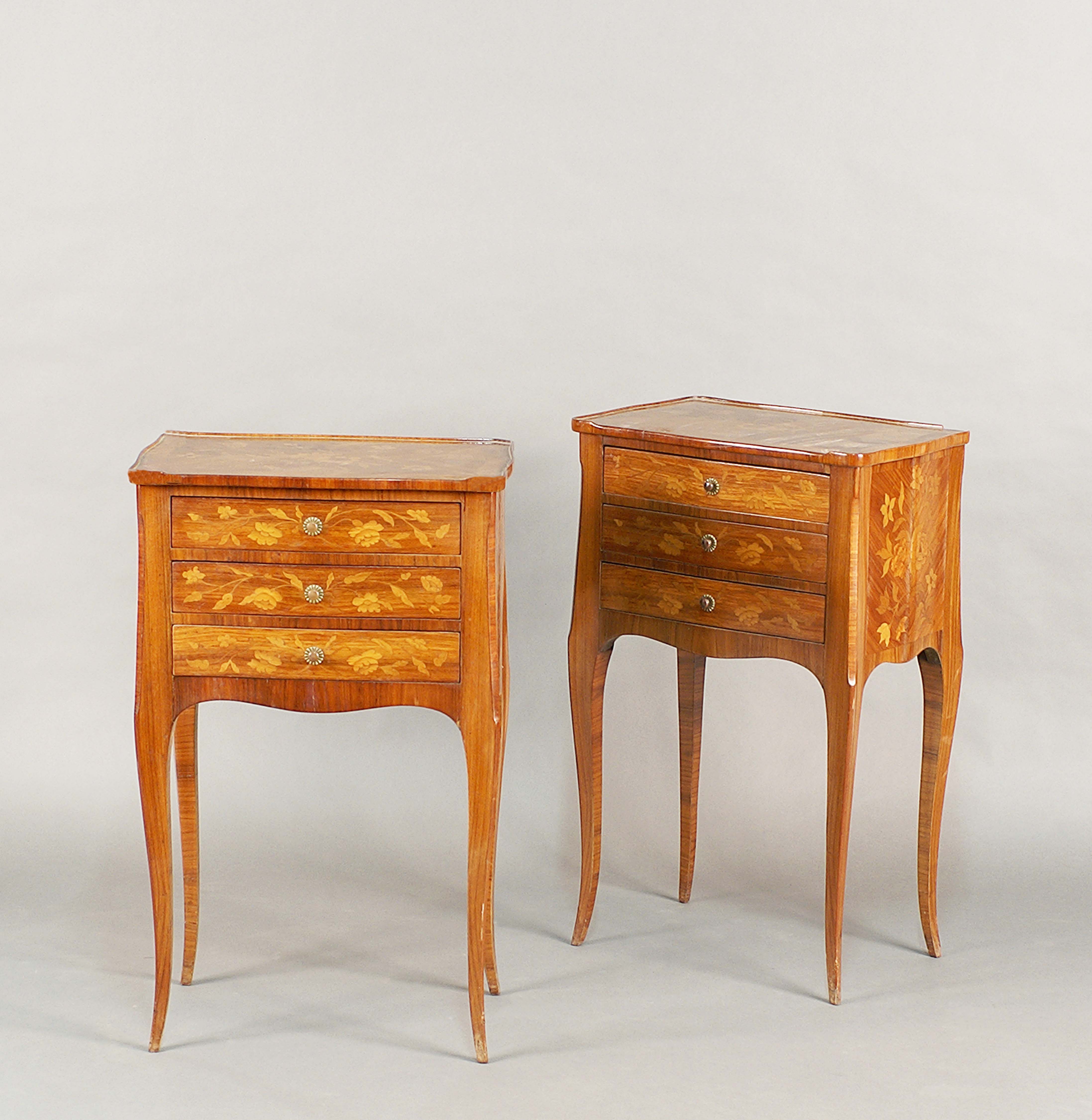 Coppia di comodini in bois de rose con intarsi a motivo floreale in legno di frutto, piano sagomato con tre cassetti sottostanti, Francia, vecchia manifattura, cm. 68x43x30 (mancanze).