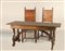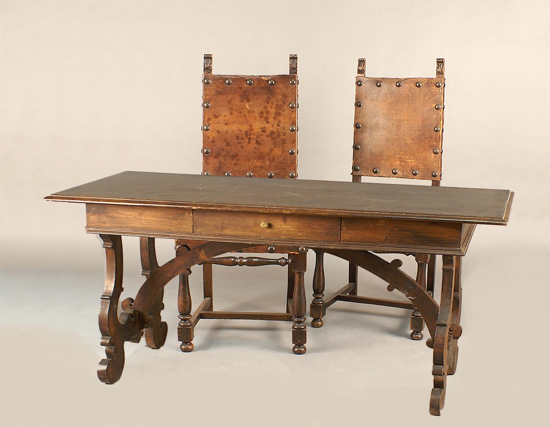Tavolo scrittoio in noce, piano rettangolare con un cassetto sottostante, sostegni a lira riuniti da traverse, completo di 2 sedie (difetti), vecchia manifattura, tavolo cm. 80x140x64.