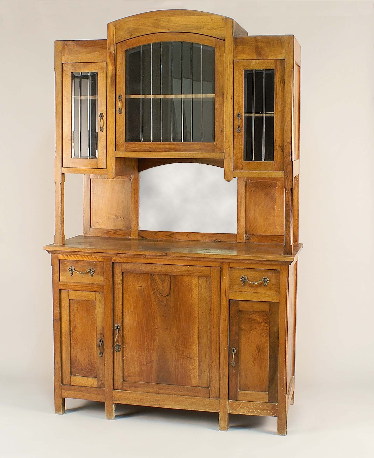 Credenza a due corpi in noce, parte superiore con tre sportelli in vetro molato, parte inferiore con due cassetti e due sportelli, inizio del XX secolo, cm. 212x131x52 (difetti e mancanze).