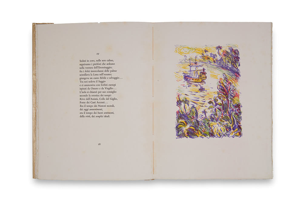 [LIBRI D'ARTISTA] -- ALBERTI, Leon Battista. Rime amorose e morali. Verona: Officina Bodoni di Giovanni Mardersteig, 1971. -- [Insieme a:] L'alfabeto di Francesco Torniello da Novara [1517]. Novara: Officina Bodoni, 1972. -- Guido GOZZANO. Liriche scelte da "I colloqui". Verona: Officina Bodoni di Giovanni Mardersteig, 1954. Rispettivamente contenenti: un'acquaforte di Annigoni raffigurante un medaglione con il ritratto di Alberti; alcune illustrazioni ed esempi delle costruzioni geometriche di alfabeti; versi di Gozzano nell'edizione originale con diciasette litografie a colori nel testo e una in nero sulla copertina di Renato Cenni. 8vo (240 x 160mm), 4to (285 x 200mm), 4to (310 x 235mm). Tirature limitate: 65/140; ?/300; esemplare ad personam. Legature editoriali, due in cofanetto. The works contain respectively: an etching by Annigoni; some illustrations and examples of the geometrical constructions of the alphabet; poems by Gozzano with 17 lithographic plates in the text and one on the front cover.