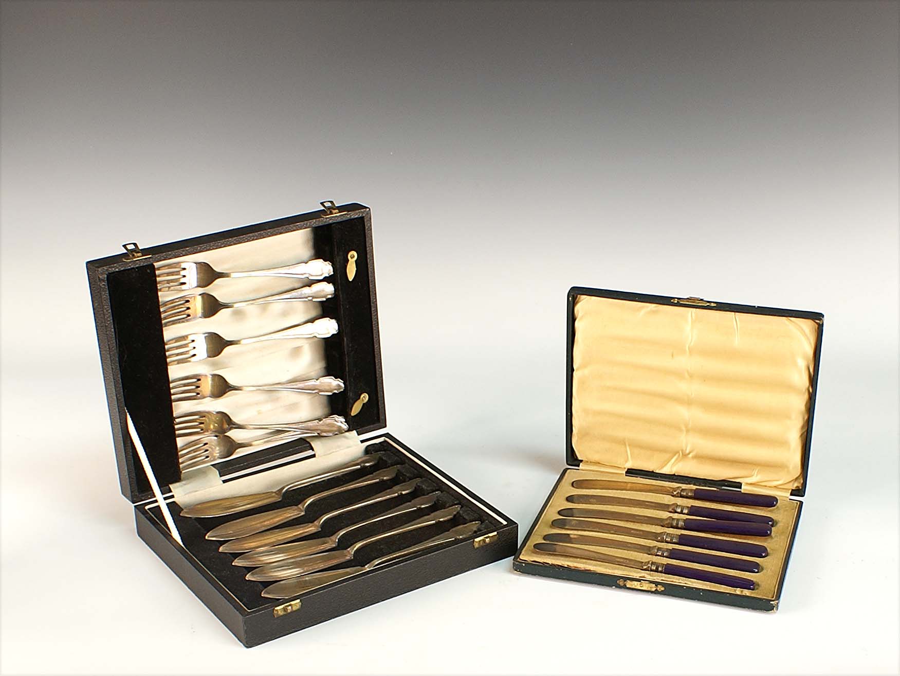 Lotto composto da un set di sei coltelli da burro in metallo con manici in resina e da un set di dodici posate da pesce in metallo, manifattura inglese, primi anni del XX secolo, entro custodie originali.