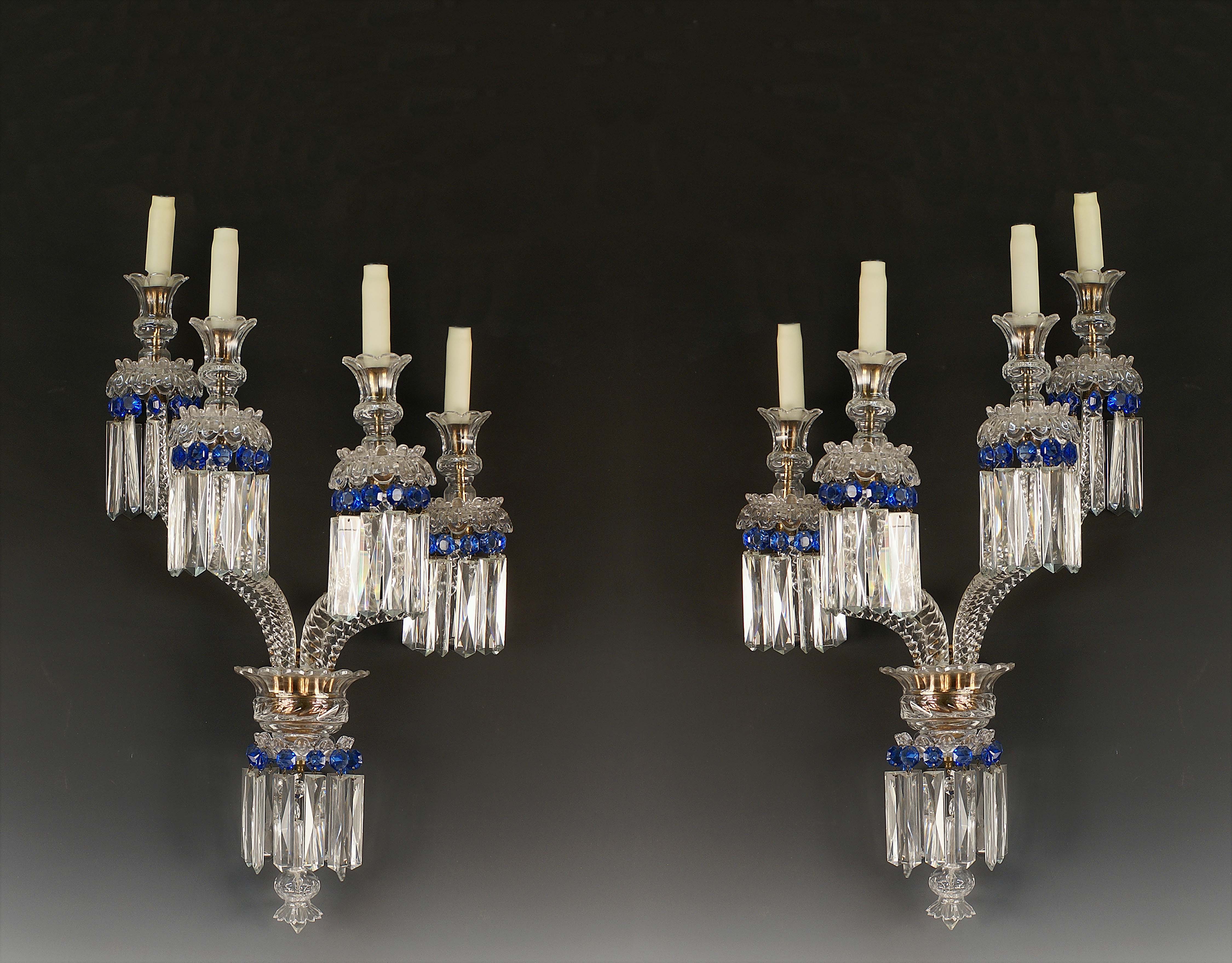 Coppia di appliques a quattro luci in vetro trasparente con pendenti parzialmente colorati blu cobalto complete di ventole, cm. 78x40.