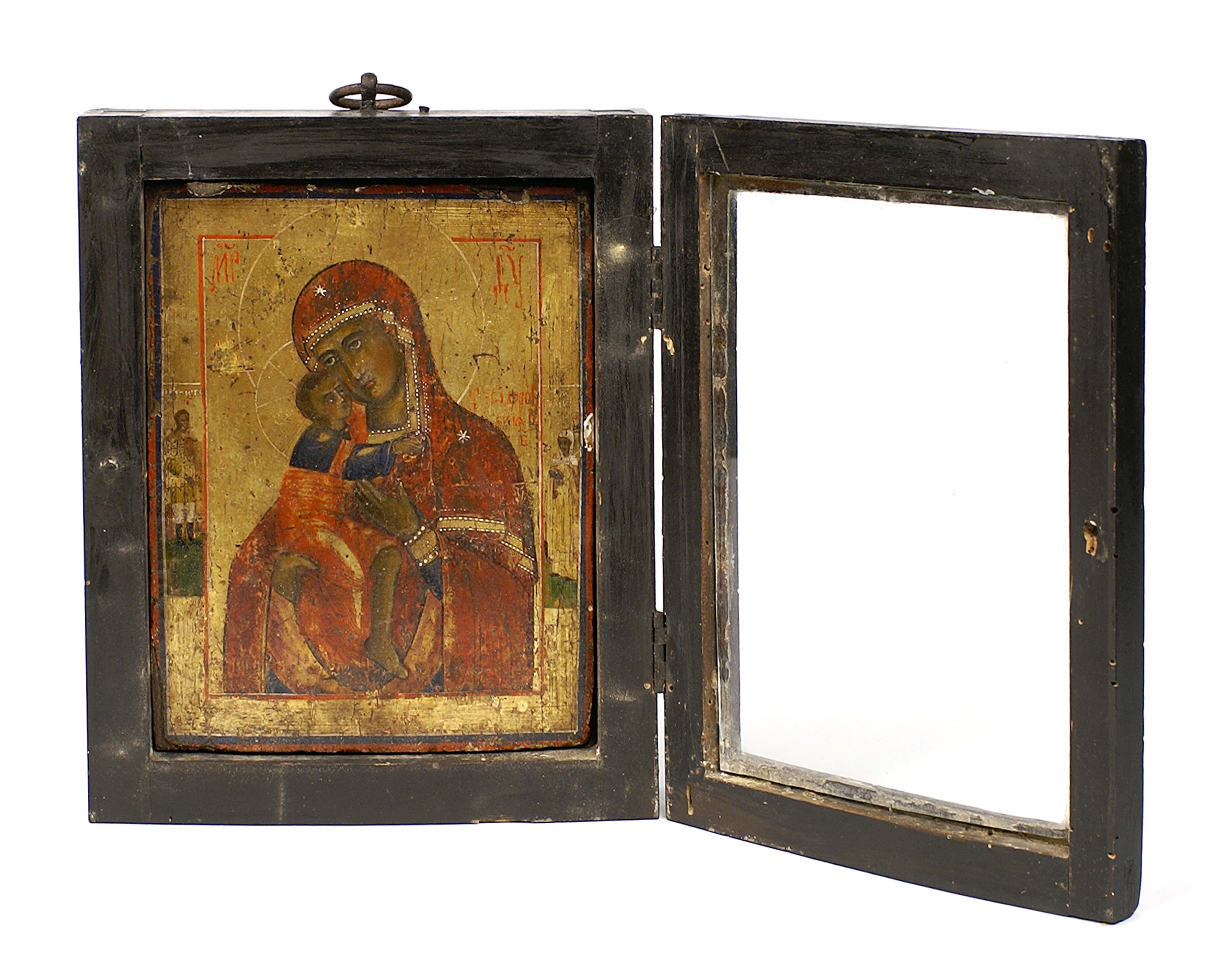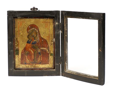 Scuola Russa del XIX secolo, "Madonna con Bambino", icona entro teca in...