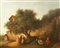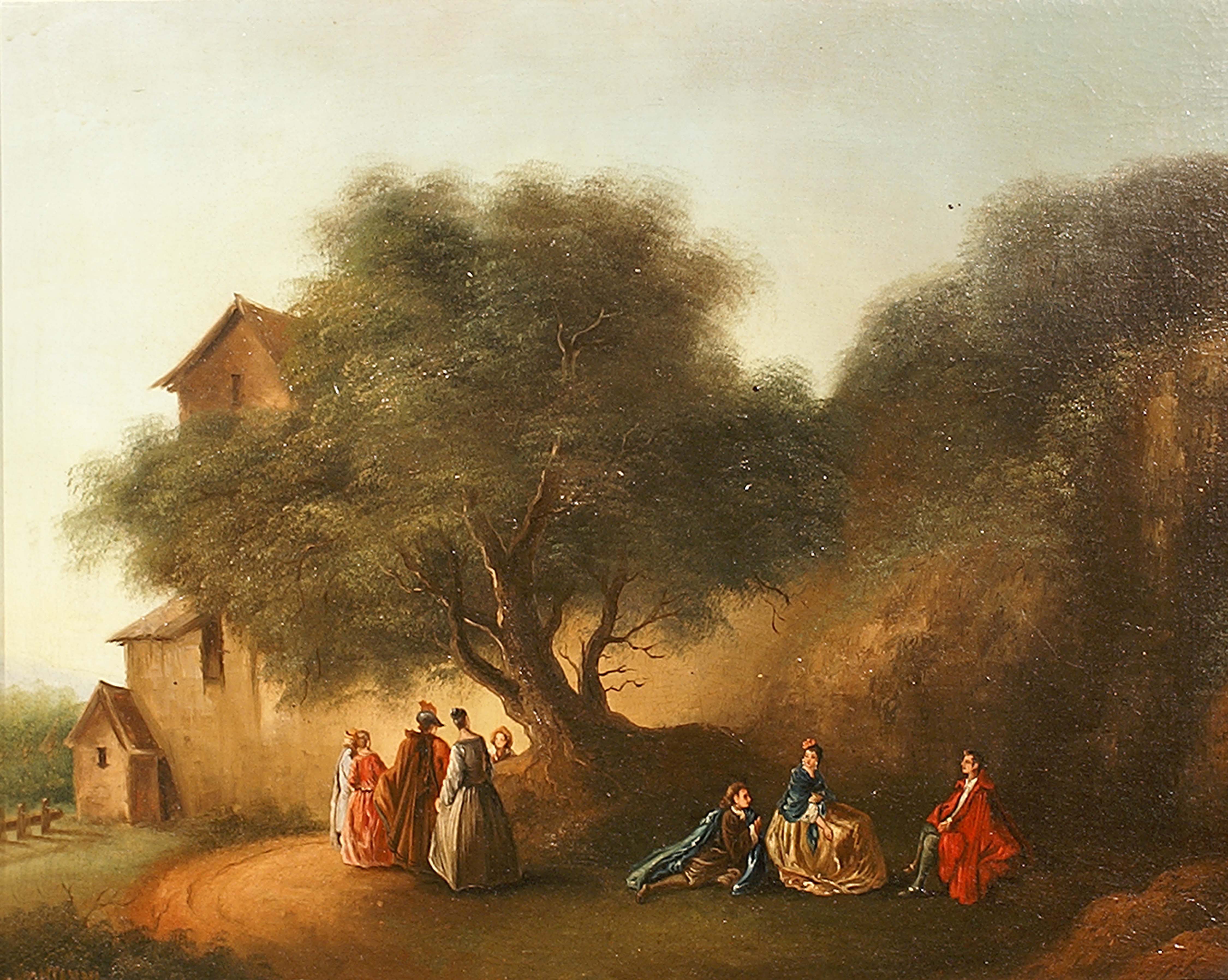 Anonimo del XX secolo, "Paesaggio con personaggi", olio su tela, cm. 41x51.