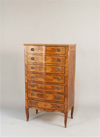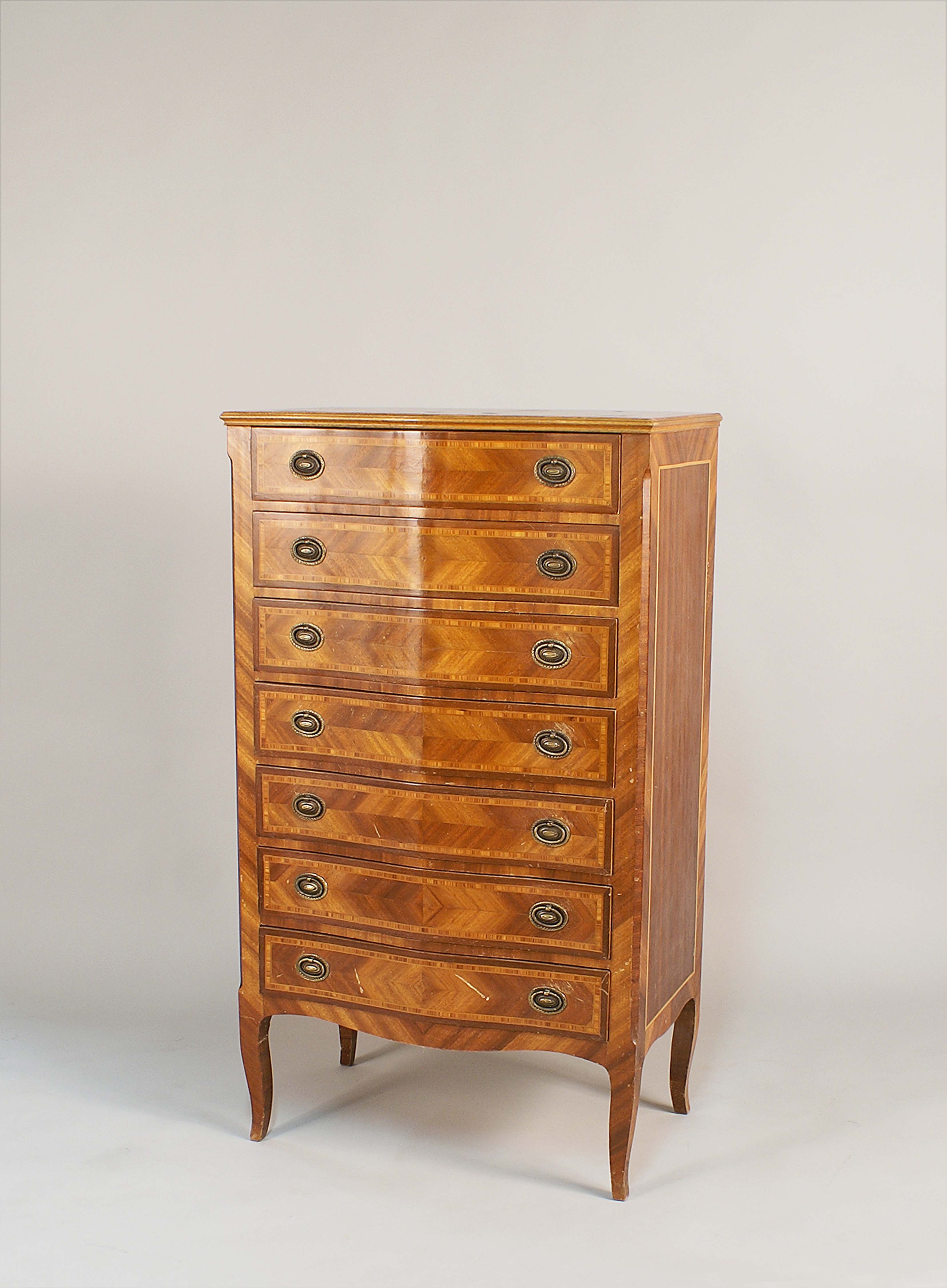 Settimino in mogano intarsiato e filettato in bois de rose e legno di bosso, fronte a sette cassetti con relative maniglie in bronzo, vecchia manifattura, cm.126x72x42.