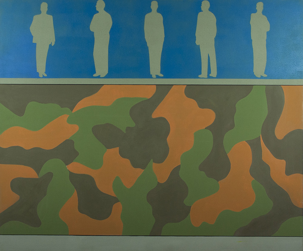 RENATO MAMBOR Roma 1936 - 2014 " Uomini mimetici " anno 2000 acrilico su tela 100 x 120 cm Titolato, firmato e datato al retro Pubblicazionesu Threads, Maretti Editori ( pag. 103 m); pubblicazione su Storelling R. Mambor, Maretti Editore ( pag. 158,159 )