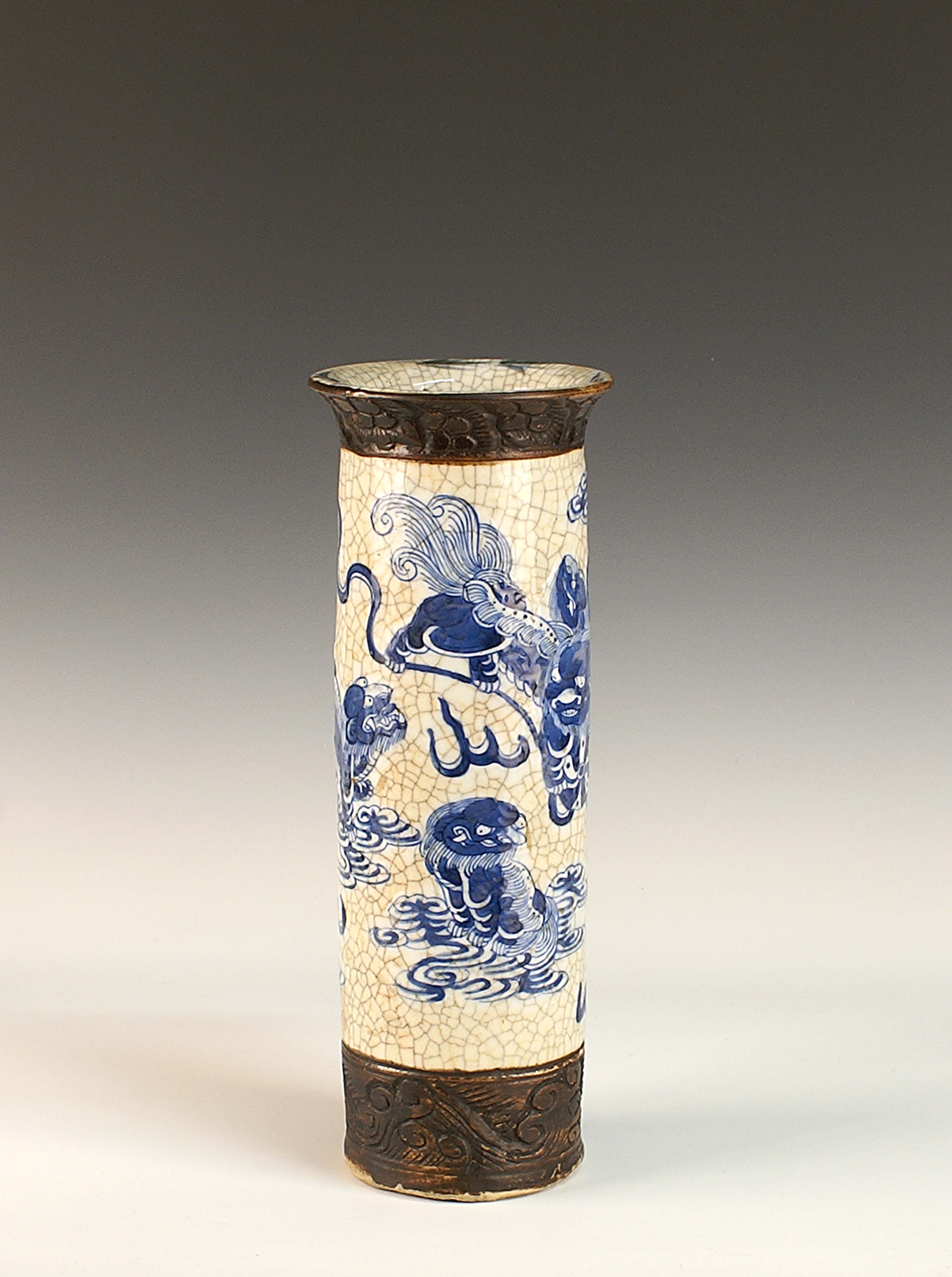 Vaso di forma cilindrica in porcellana decorata in blu cobalto a raffigurare cani di Pho, Cina, XIX secolo. h. cm. 31.