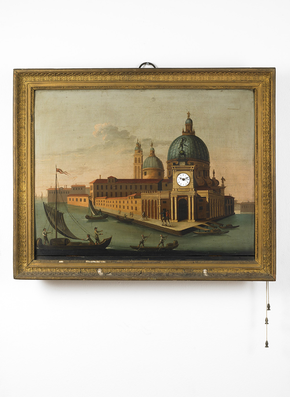 ANONIMO, AUSTRIA Orologio inserito in dipinto su tavola Epoca 1800 circa Movimento con carica giornaliera, suoneria delle ore e dei quarti su gong Quadrante in smalto bianco con cifre romane Misura h cm 65 comprensiva di cornice (difetti) ANONYMOUS AUSTRIA Clock inserted on oil on panel Circa 19th century Daily-wind movement, hour and quarter striking on gong White enamel dial with Roman numerals h cm 65 including frame (defects)