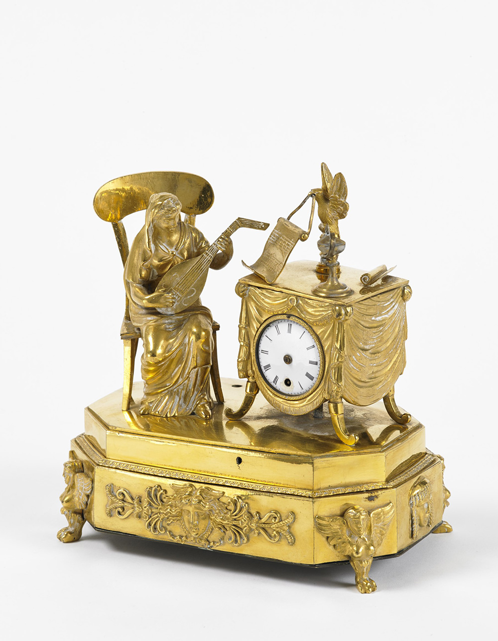 Orologio da tavolo in bronzo dorato con allegoria della musica, carillon nella base