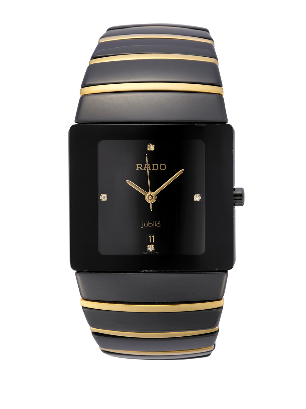 RADO Orologio da polso da uomo in ceramica e oro, con bracciale integrato Epoca recente Quadrante, movimento e cassa firmati Movimento al quarzo Quadrante nero con indici in diamanti Cassa n. 36030880 Misure mm 32x39 RADO Gent's ceramic and 18K gold wristwatch Recent production Dial, movement and case signed Quartz movement Black dial, applied diamond indexes mm 32x39