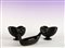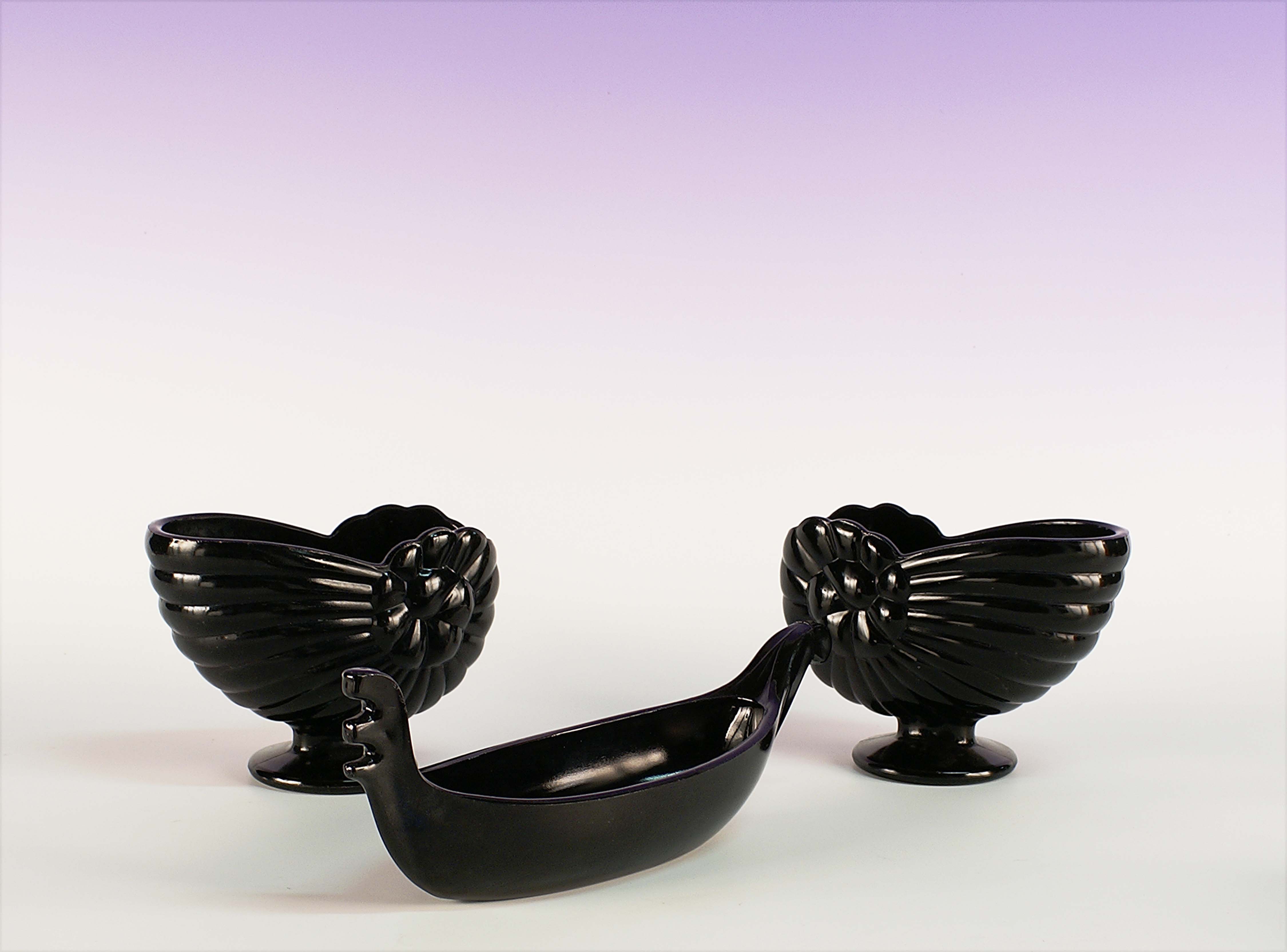 Lotto composto da una coppia di cestini a conchiglia ed uno a navicella in vetro nella tonalità del nero, Murano, anni 70.