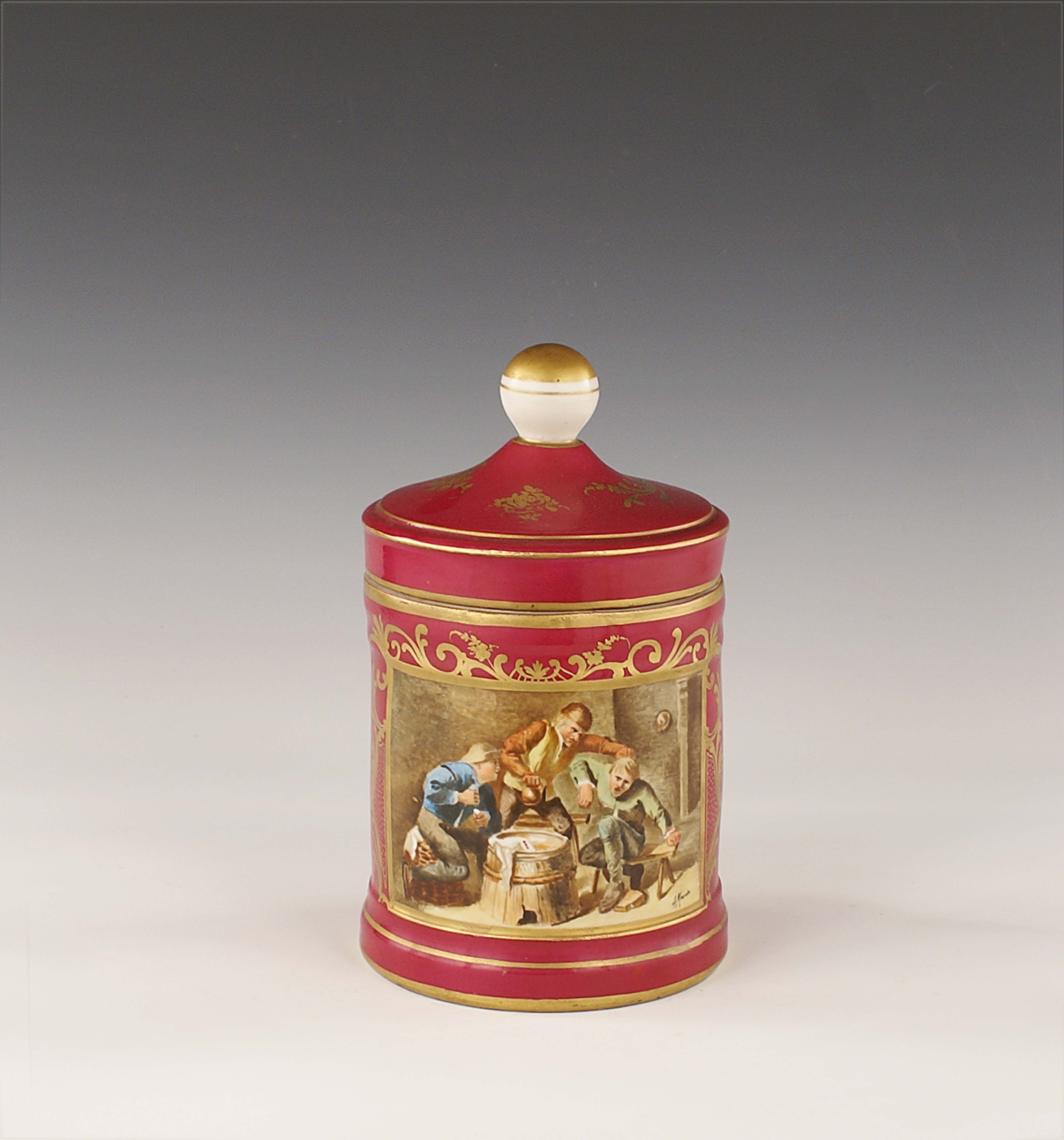 Scatola con coperchio di forma circolare in porcellana policroma e parzialmente dorata, Vienna, vecchia manifattura, h. cm. 24.