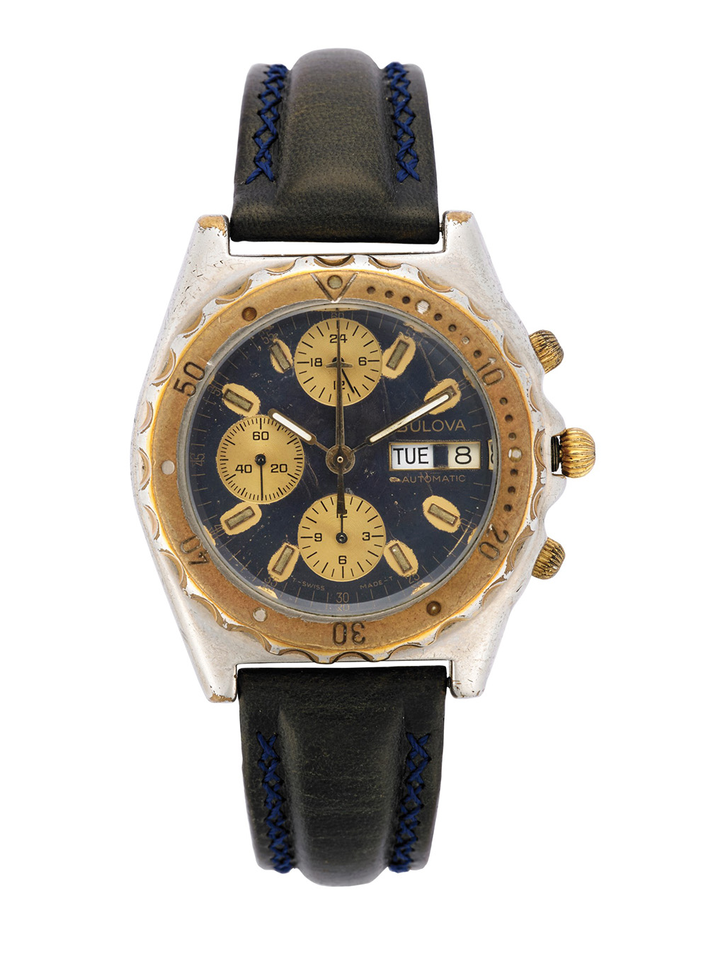 BULOVA Orologio da polso da uomo in acciaio Anni '50 Quadrante firmato Movimento con carica automatica Quadrante blu con indici, tre quadrantini ausiliari per la cronografia, finestrella per giorno e data Cassa n. 4,036.0.0.65 Diam. mm 40 circa BULOVA Gent's steel wristwatch 1950s Dial signed Automatic movement Blue dial with indexes, and auxiliary dials Diam. mm 40 circa