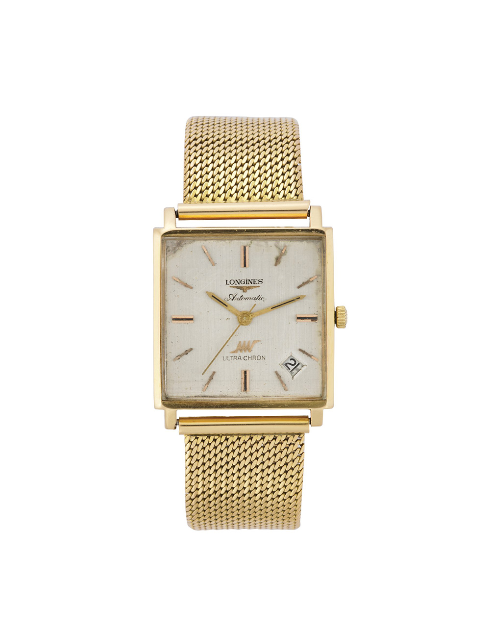 LONGINES, automatico ultracron Orologio da polso da uomo in oro 18K, bracciale non pertinente Anni '70 Quadrante, movimento e cassa firmati Movimento con carica automatica Quadrante argentato con indici riportati, secondi al centro, finestrella per data Cassa n. 15-472104 Misure mm 30x37 LONGINES Gent's 18K gold wristwatch 1970s circa Dial, movement and case signed Automatic wind Silvered dial with indexes mm 30x37