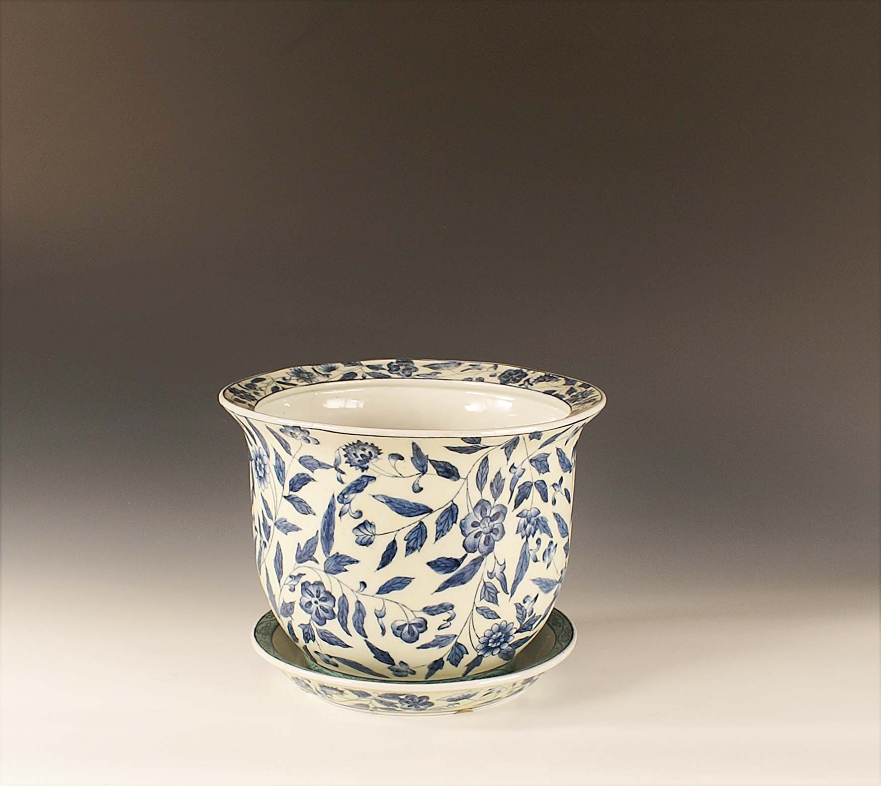Cachepot con relativo sottovaso in porcellana bianca e blu cobalto, Cina,...