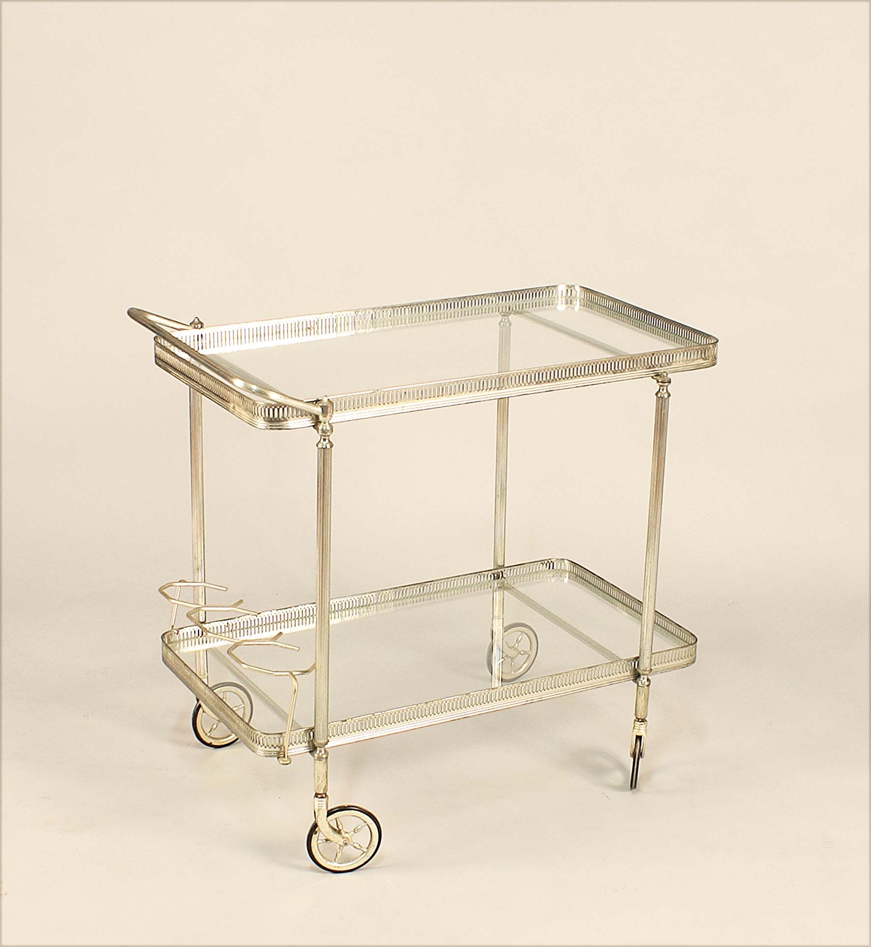 Carrello portavivande in metallo argentato a due piani con relativo portabottiglie, provvisto di rotelle, vecchia manifattura, cm. 79x64x44.