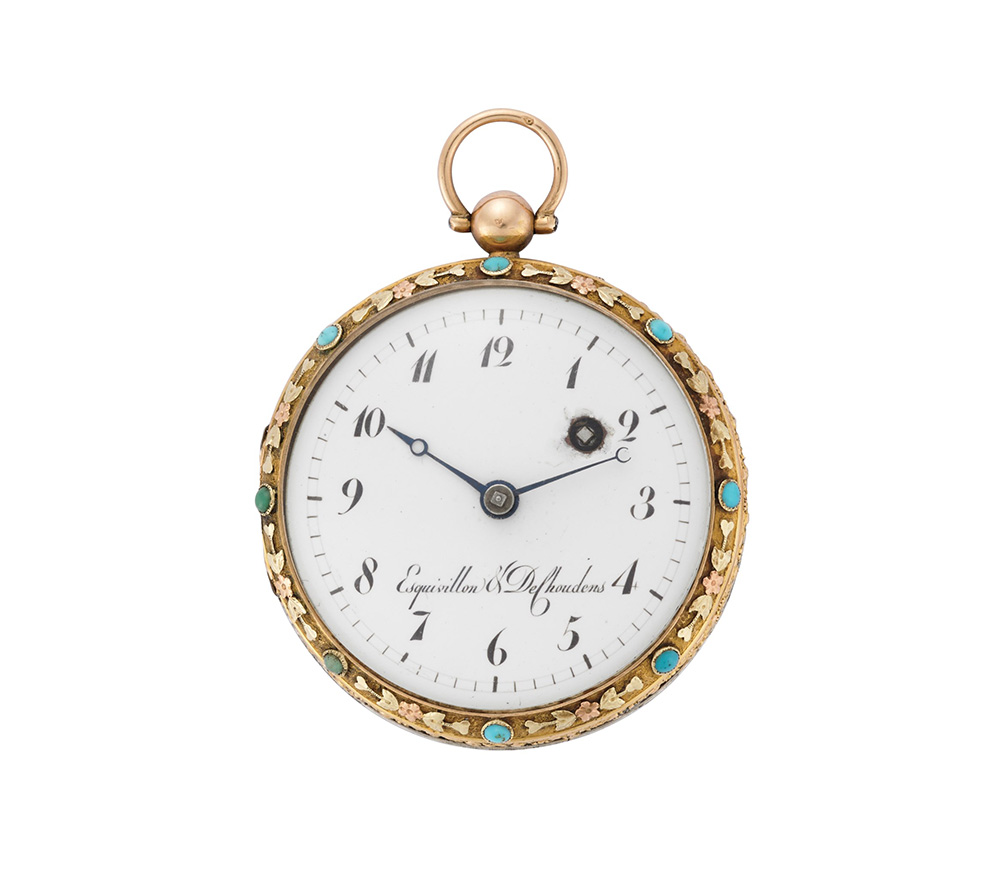 ESQUIVILLON & DE CHOUDENS Orologio da tasca da uomo in oro 18K con granati e turchesi Epoca metà sec. XIX Movimento con carica a chiavetta Quadrante in smalto bianco con numeri arabi Diam. mm 43 ESQUIVILLON & DE CHOUDENS Gent's 18K gold pocket watch Mid 19th century Key-wind movement White enamel dial with Arabic numerals Diam. mm 43