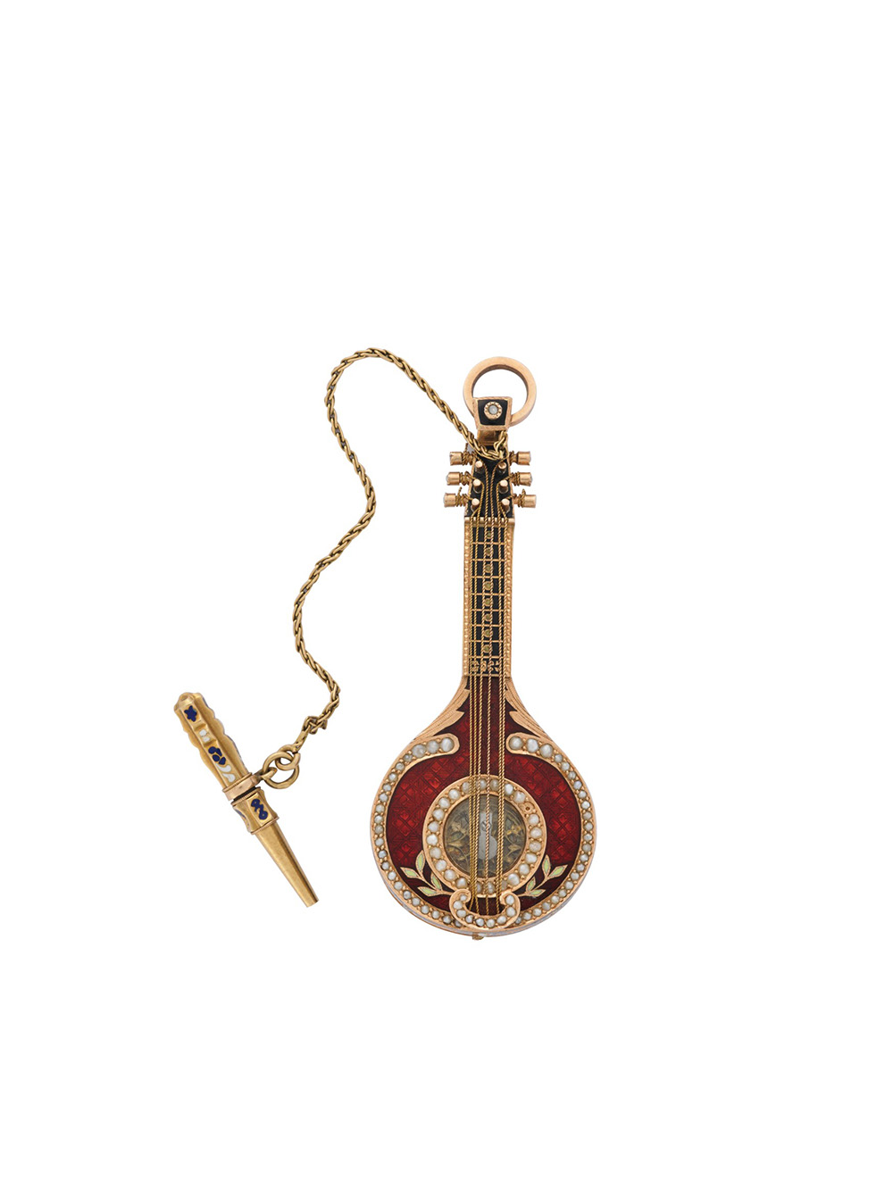 ANONIMO Orologio a forma di mandolino in oro 18K e smalti Epoca inizio sec. XIX Movimento con carica a chiavetta, scappamento a verga Quadrante in smalto bianco con cifre arabe Misure mm 64x27 circa (una perla mancante) ANONYMOUS 18K gold mandolin-shaped pocket watch Early 19th century Key-wind movement White enamel dial with Roman numerals mm 42x26 circa (pearl deficient)
