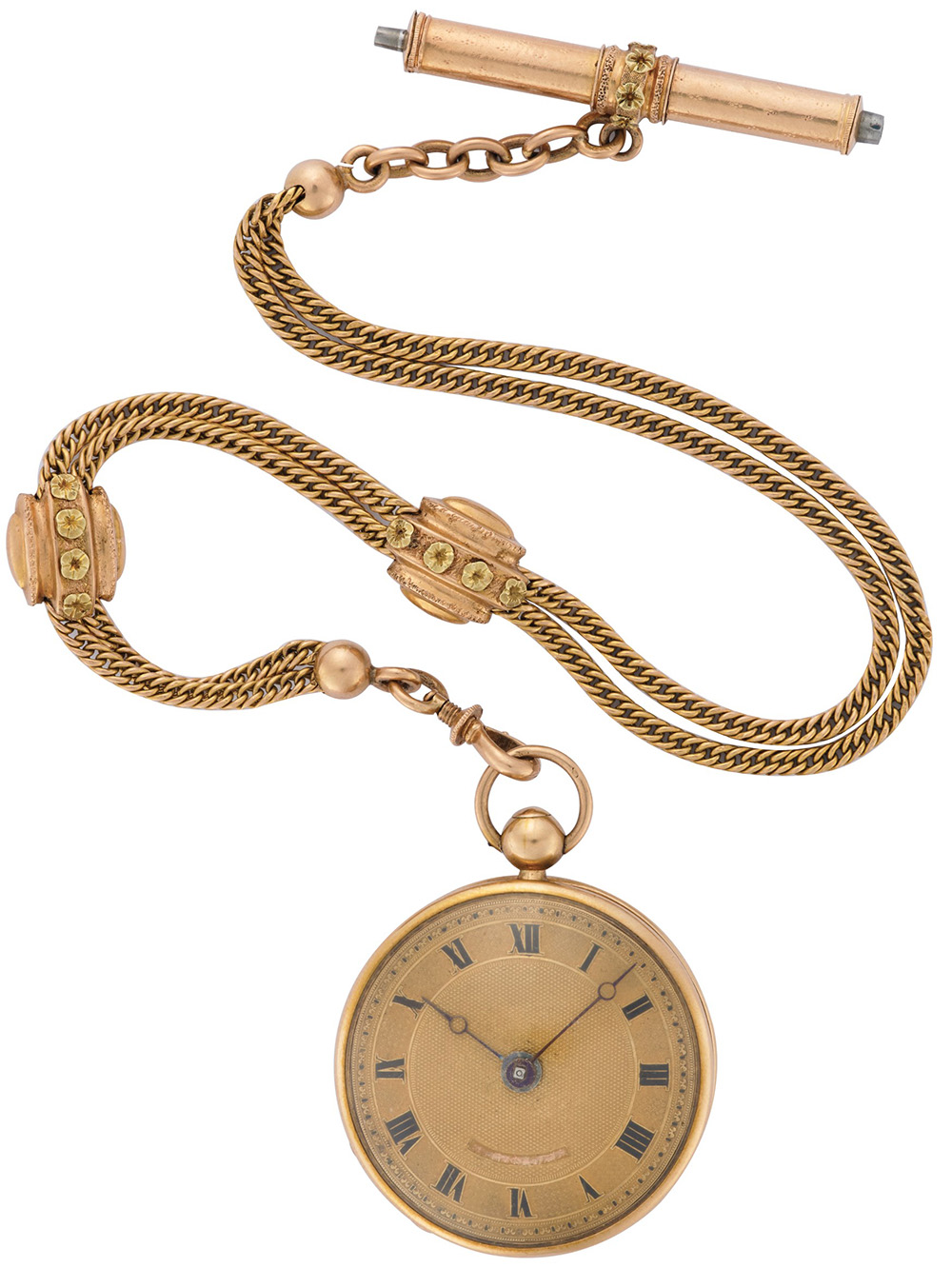 LOUIS HUMBERT, Genève Orologio da uomo da tasca in oro 18K, con catena Inizio sec. XIX Movimento e cassa firmati Movimento con carica a chiavetta, scappamento a verga Quadrante in oro con cifre romane smaltate Cassa n. 6229 Diam. mm 40 LOUIS HUMBERT, Genève Gent's 18K gold pocket watch Early 19th century Movement and case signed Key-wind movement Gold dial with Roman numerals Diam. mm 40