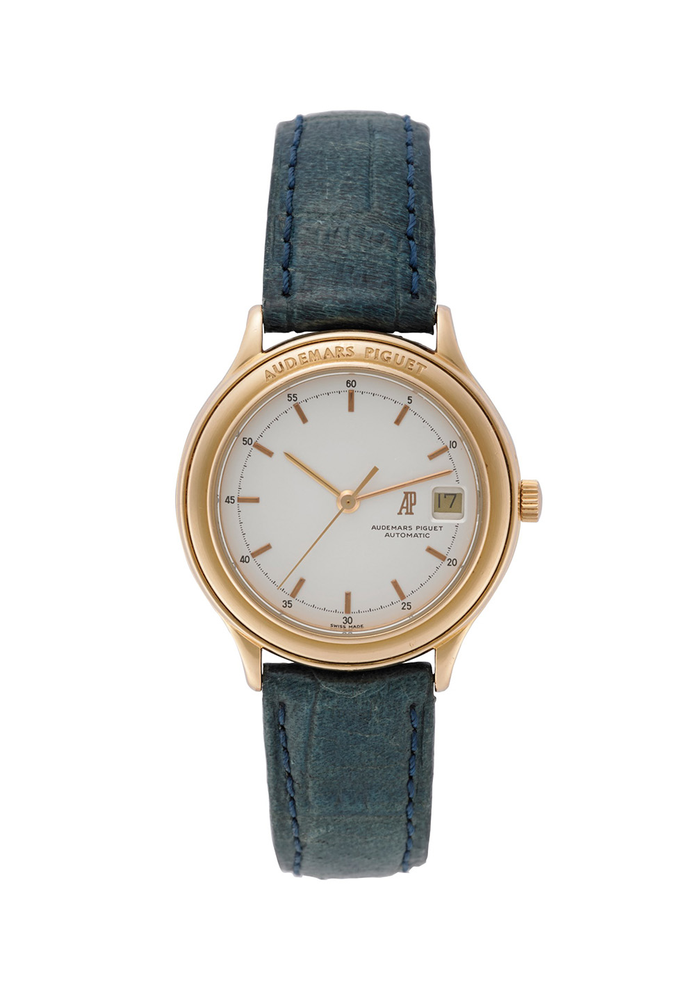AUDEMARS PIGUET Orologio da polso da donna in oro 18K Anni '90 Quadrante, movimento e cassa firmati Movimento con carica automatica Quadrante argentato con indici riportati, secondi al centro, data Cassa n. C76896 Diam. mm 32 AUDEMARS PIGUET Lady's 18K gold wristwatch 1990s Dial, movement and case signed Automatic movement Silvered dial, applied indexes Diam. mm 32