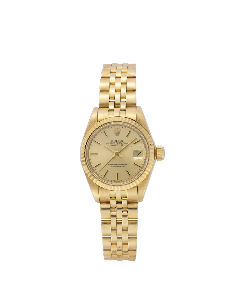 ROLEX Orologio da polso da donna in oro 18K Anni '70 Quadrante, movimento e cassa firmati Movimento con carica automatica Quadrante champagne con indici riportati, secondi al centro, data Ref. 6917 Cassa n. 5897999 Diam. mm 24 Con astuccio e garanzia ROLEX Lady's 18K gold wristwatch 1970's Dial, movement and case signed Automatic movement Champagne dial, applied indexes, date Ref. 6917 Cassa n. 5897999 Diam. mm 24 With original