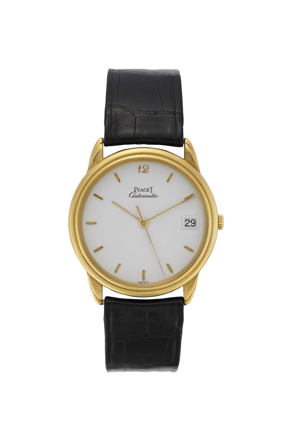 PIAGET Orologio da polso da uomo in oro 18K Anni '80 Quadrante, movimento e cassa firmati Movimento con carica automatica Quadrante bianco con indici riportati e numero arabo, data Cassa n. 15988 480904 Diam. mm 33 PIAGET Gent's 18K gold wristwatch 1980's Dial, movement and case signed White dial, applied indexes, Arabic numerals, date Case n.15988 480904 Diam. mm 33