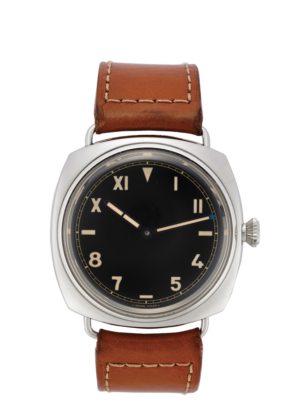 PANERAI Orologio da polso da uomo in acciaio Epoca recente Quadrante, movimento e cassa firmati Movimento con carica manuale Quadrante nero con cifre romane, numeri arabi ed indici Cassa n. BB1246689 Misure mm 47x47 circa PANERAI Gent's steel wristwatch Recent production Dial, movement and case signed Automatic movement Black dial with indexes, Arabic and Roman numerals mm 47x47 circa