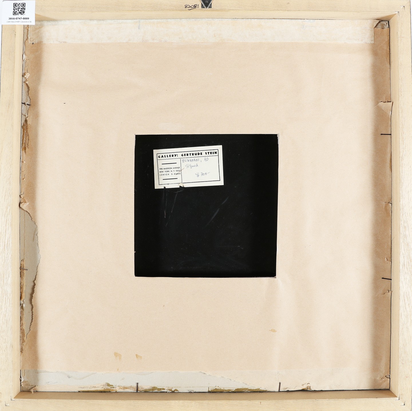 REINHARDT AD (1913 - 1967) Senza titolo. . Acrilico su plexiglass. Cm 30,50 x 30,50. Pezzo unico. Firma AR in basso a destra, Firma completa e dedica a "Dare Basamon" in basso a sinistra. Al retro cartiglio della Galleria The Gallery: Gertrude Stein, New York. . Cornice presente