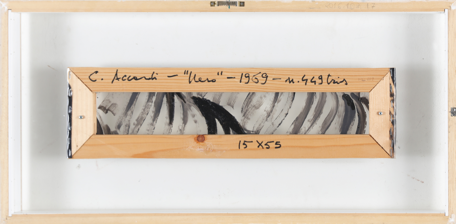 ACCARDI CARLA (1924 - 2014) Nero. 1969. Vernice su sicofoil. Cm 15,00 x 55,00. Al retro titolo, firma e anno. Opera archiviata presso loStudio Accardi, come documentazione fotografica allegata all'opera, riportante la firma dell'artista e il relativo numero di inventario. Cornice presente