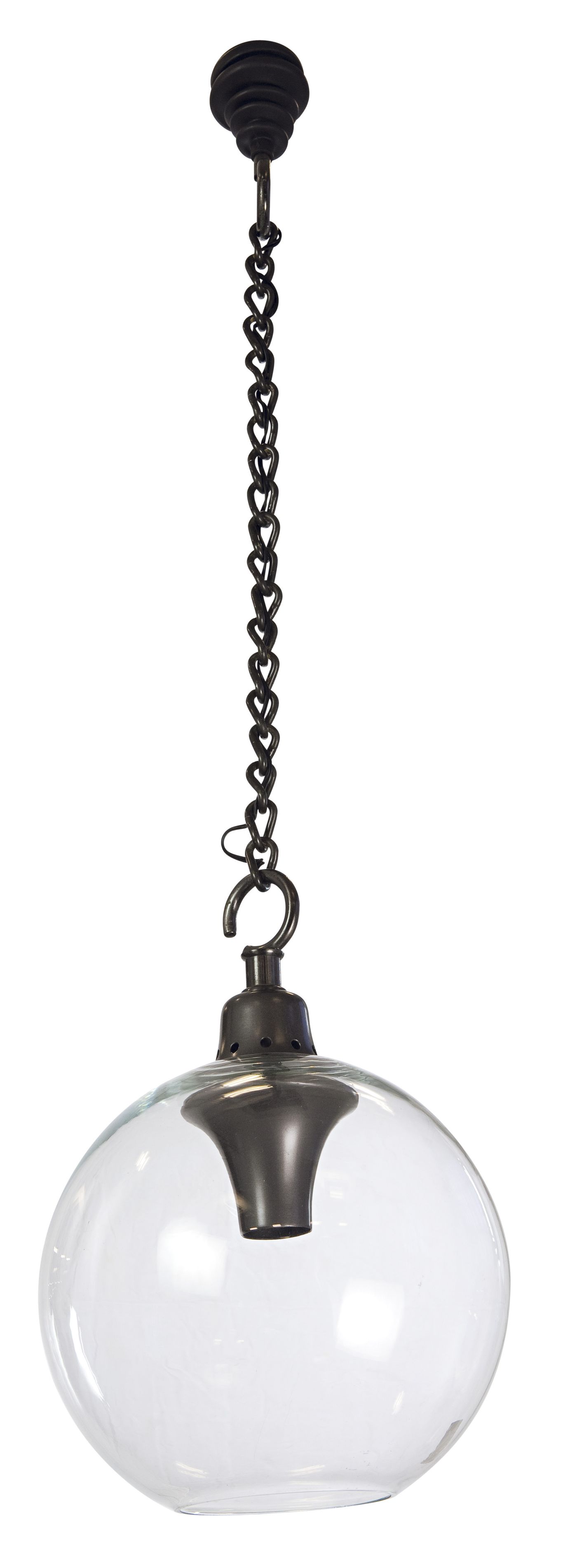CACCIA DOMINIONI LUIGI – Boccia, Sfera in vetro trasparente sorretto da portalampade in metallo color canna di fucile metallizzato con catena in metallo. Coprifilo in gomma estensibile. Prod. Azucena. Diam. cm 30. Bibl.: Fotocopia catalogo Azucena disponibile