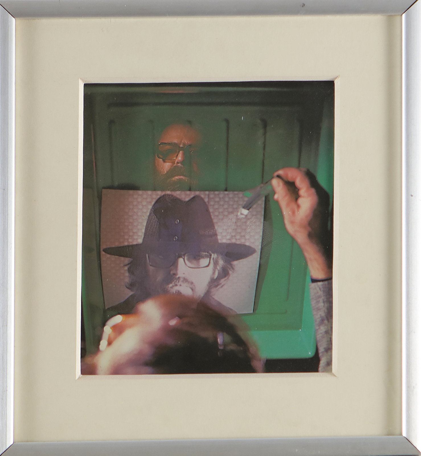 PISTOLETTO MICHELANGELO (n. 1933) Self-portrait in the mirror. 1976. Colour photo. Cm 18,00 x 21,00. Dedication to Archimede at the back. Art basel 1995 and Toselli Gallery labels at the back on the supporting cardboard. Provenance: MArgiacchi Art Galley, Arezzo; Private collection, Arezzo. Cornice presente
