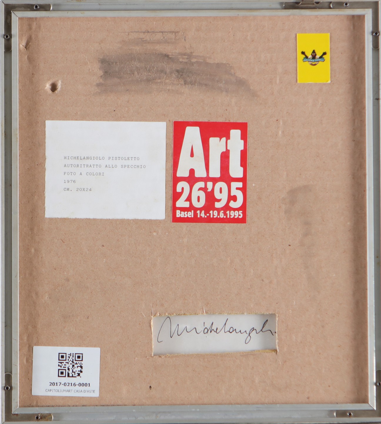 PISTOLETTO MICHELANGELO (n. 1933) Autoritratto allo specchio. 1976. Fotografia a colori. Cm 18,00 x 21,00. Al retro reca una dedica riportante la seguente dicitura: "Caro Archimede, come tu sai l'arte parla da se, così come la magia del fuoco che viene dallo specchio. Ti abbraccio, Michelangelo". Sempre al retro sul cartone di supporto presenta le etichette di Art Basel '95 e della Galleria Toselli. Provenienza: Galleria D'arte Margiacchi, Arezzo; Collezione privata, Arezzo. Cornice presente