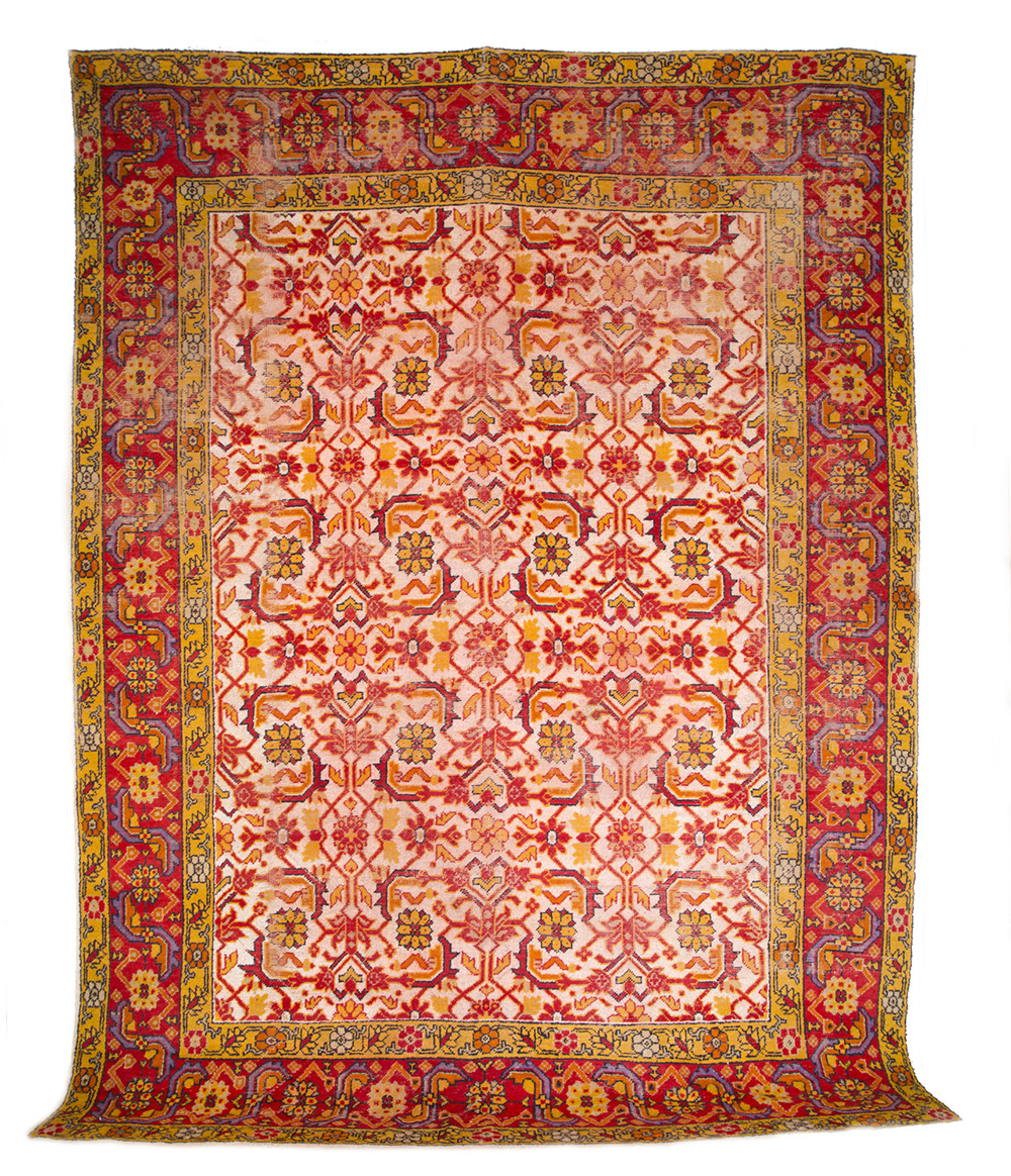 Tappeto a fondo beige e rosso decorato con fiori stilizzati, cm 390x290