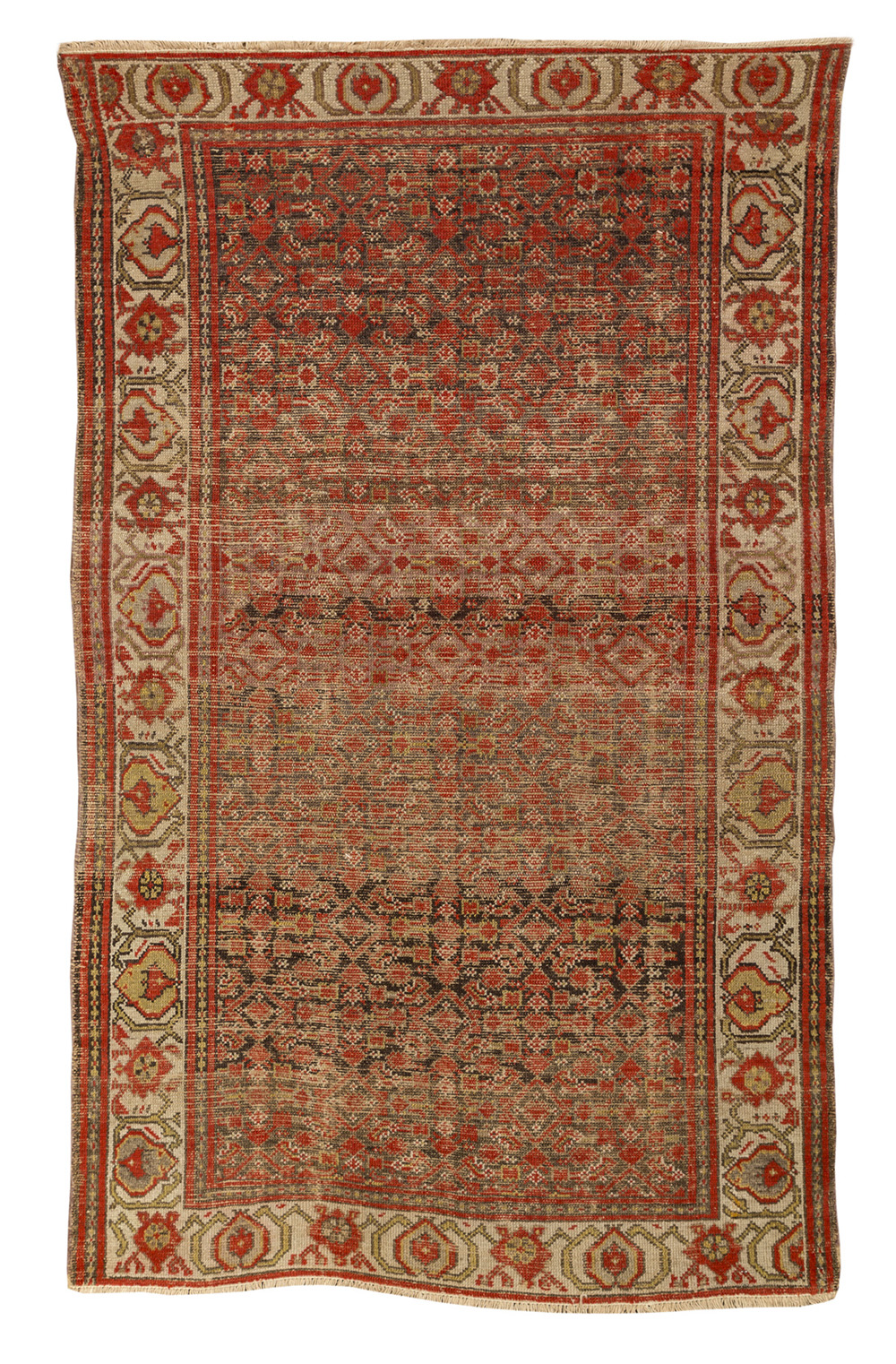 Tappeto fondo rosso decorato a motivi vegetali, cm 180x110. Usure
