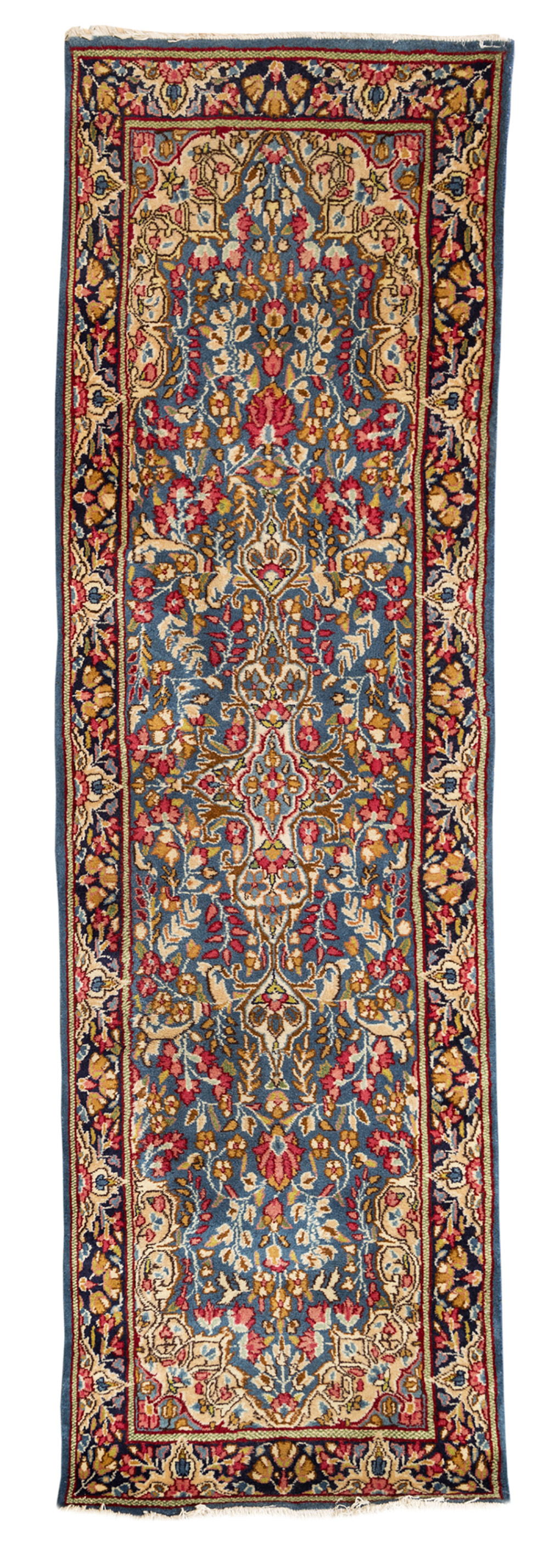 Guida a fondo beige decorata a motivi floreali nei toni del rosso, nero e celeste, cm 245x74