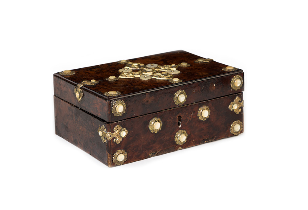 Scatola in legno con cerniere e applicazioni in bronzo e madreperla, cm 10x23x15