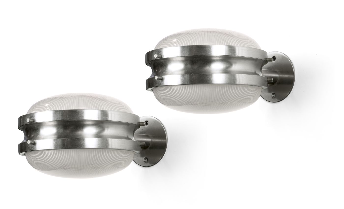 MAZZA SERGIO - Gamma C, Due faretti da parete. Ottone nichelato opaco, diffusori in cristallo pressato. Prod. Artemide 1965 circa. Diam. cm 20. Bibl.: Fotocopia catalogo Artemide 1970 disponibile