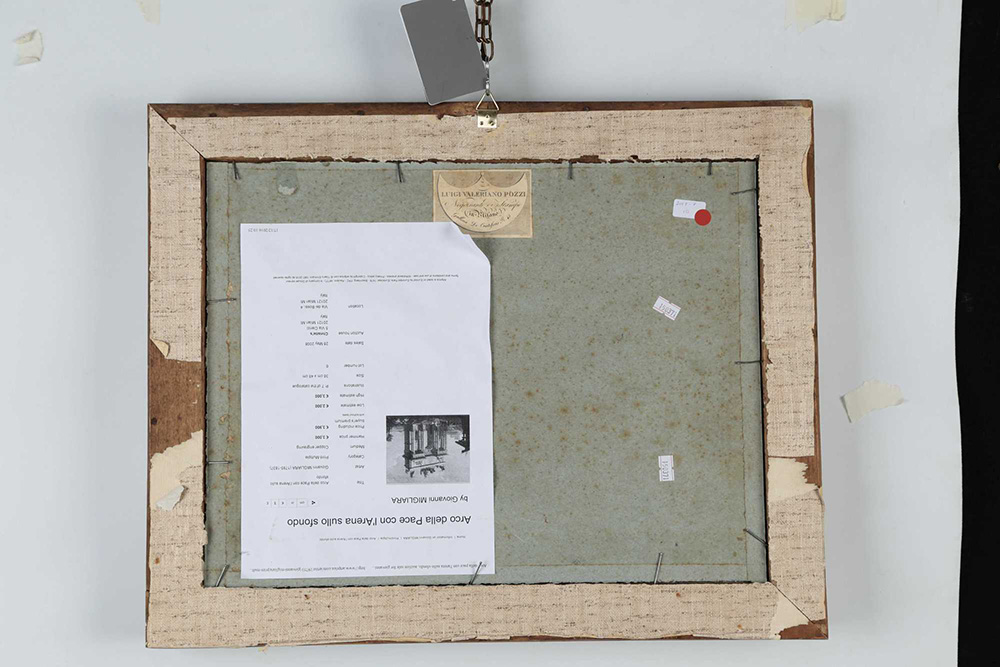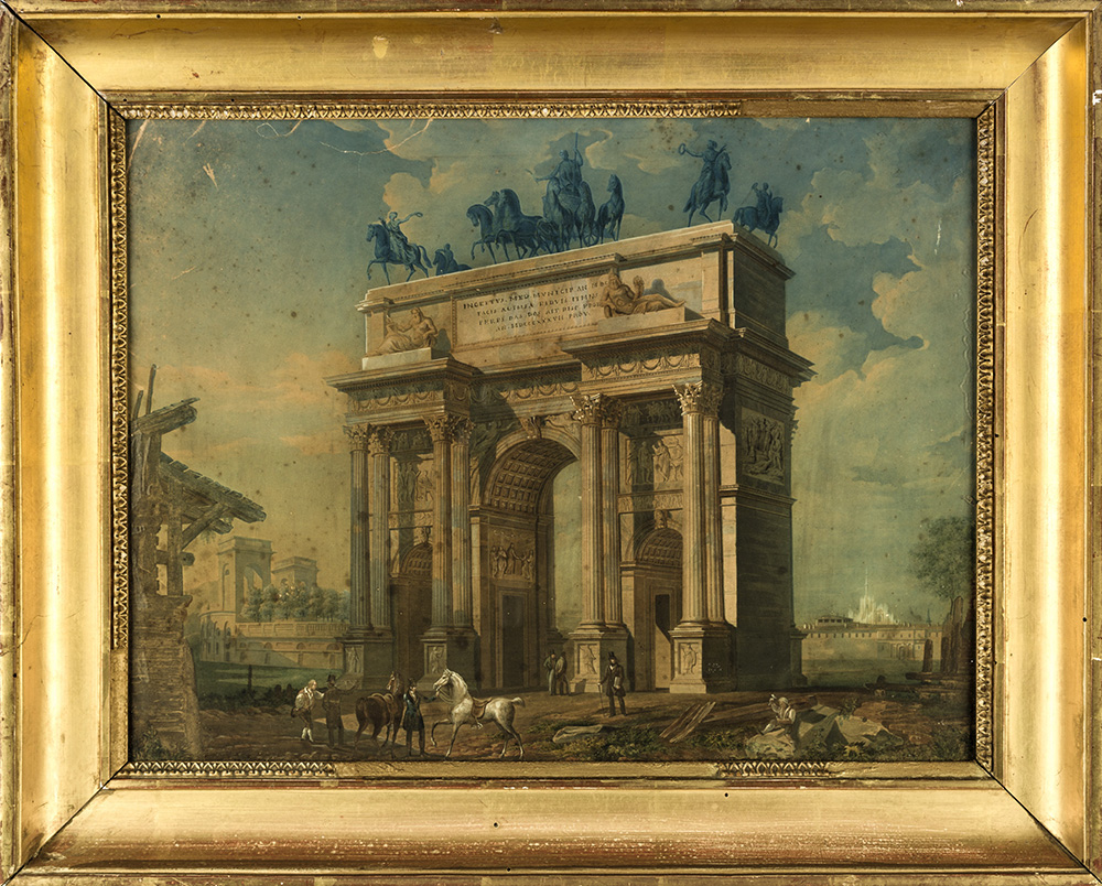 Arco della Pace a Milano con l'arena sullo sfondo, incisione acquerellata e rialzata in gomma arabica, misure cm 35x75