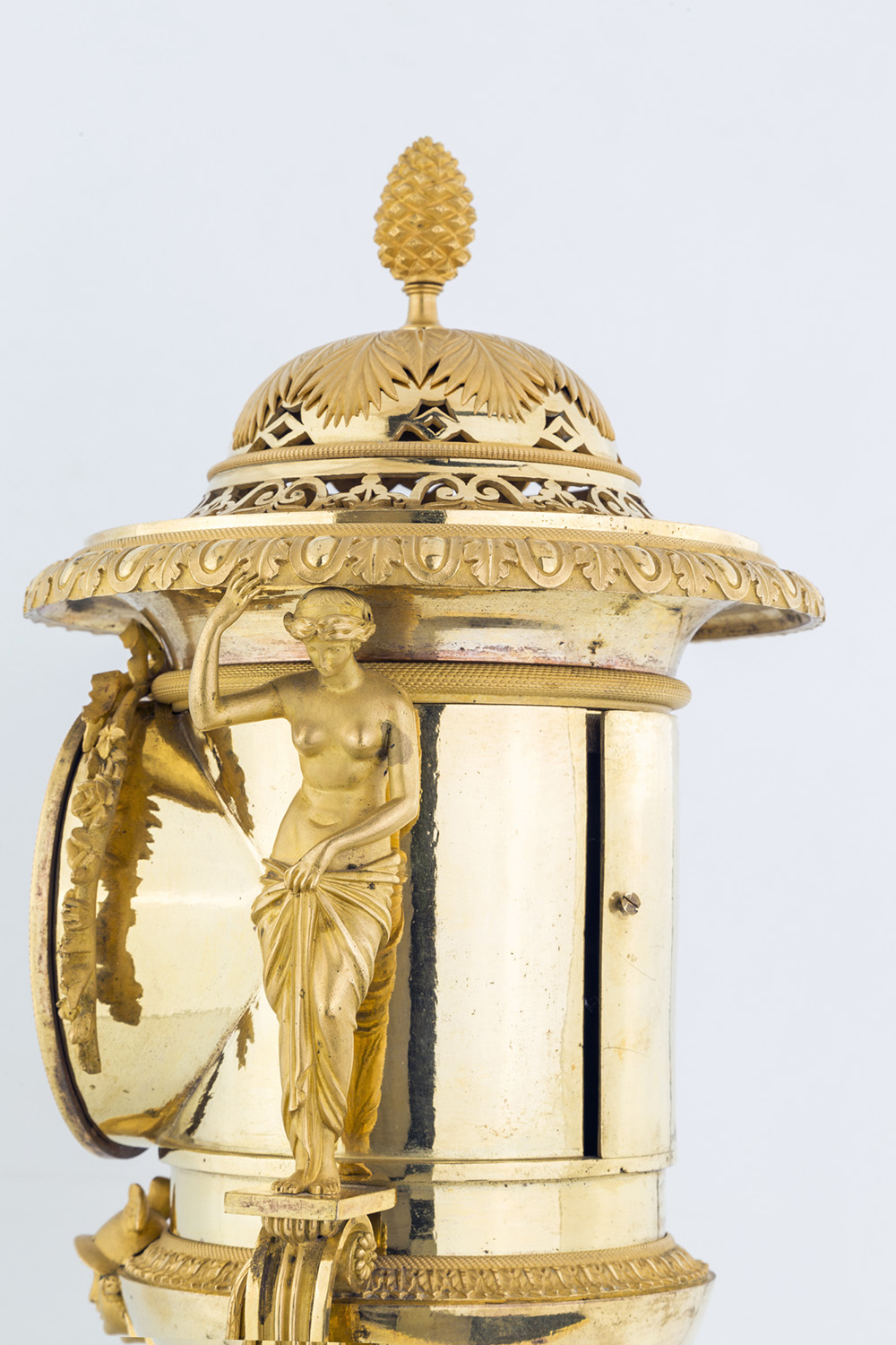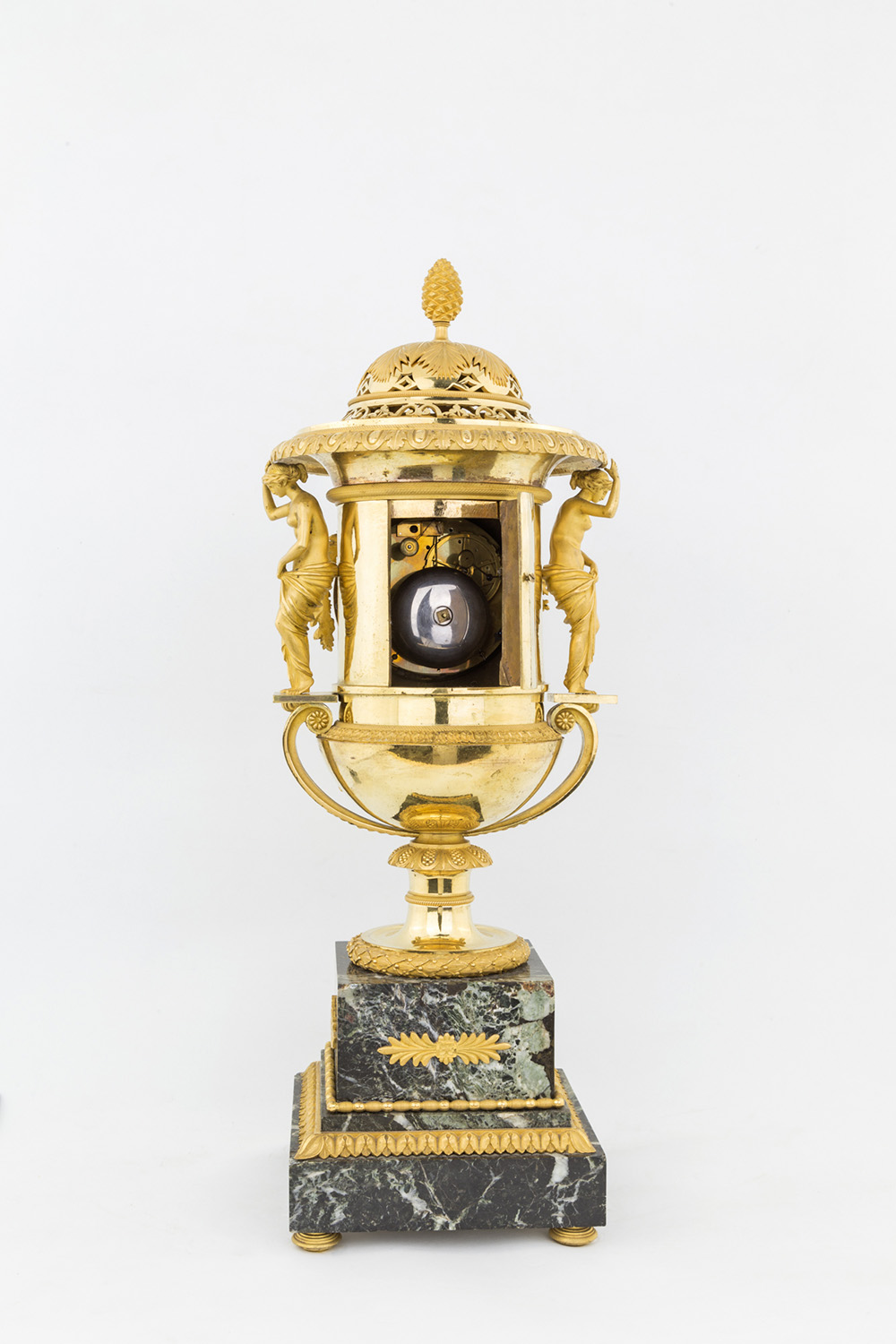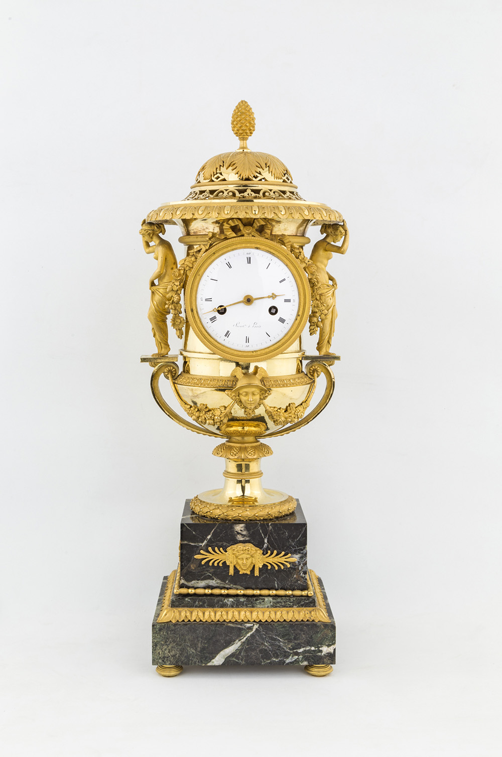 Orologio periodo Impero ,Francia (1804-1815) Questo raffinato orologio a forma di vaso Medici riprende il famoso modello in porcellana di Sèvres creato dallo scultore francese Louis-Simon Boizot (1743-1809) e dal bronzista Pierre-Philippe Thomire (1751 -1843) e commissionato dal conte d'Angiviller della Garde-Meuble di Corona e consegnato a Luigi XVI e Mana Antonietta a Versailles nel 1783. La qualità esecutoria di questo orologio è straordinariamente curata nei minimi dettagli, sono presenti fregi in stile neoclassico, che comprendono ovali, foglie di palma, foglie di acanto e ghirlande, sulle anse si elevano due donne vestite all'antico con abiti drappeggiati. Il coperchio dell'orologio è finemente traforato, sulla sommità dello stesso è presente una pigna. Sulla base del vaso è presente la figura di Mercurio. Il quadrante dell'orologio riporta il nome dell’orologiaio, Sirost a Paris. Il movimento è stata realizzato dall'orologiaio parigino Sirost, che aveva la sua attività a rue Bertin-Poiré tra il 1806-1810 e successivamente in rue des Fontaines nel 1840. Movimento: doppio bariletto con sospensione di seta e campana. Un orologio identico a questo esemplare, si trova presso il castello di Fontainebleau, fu acquistato il 23 agosto 1806. Pierre-Philippe Thomire è stato il più importante bronzista del Primo Impero francese. Venne nominato ciseleur de l'empereur da Napoleone, collaborò con la manifattura di Sèvres (casse di orologio in bronzo e porcellana), produsse orologi di grande qualità, candelabri, figure a bassorilievo e ornamenti. Collaboro con J.-B.-C. Odiot alla culla per il re di Roma (Vienna, Kunsthistorisches Museum). Dimensioni cm 58x18x18