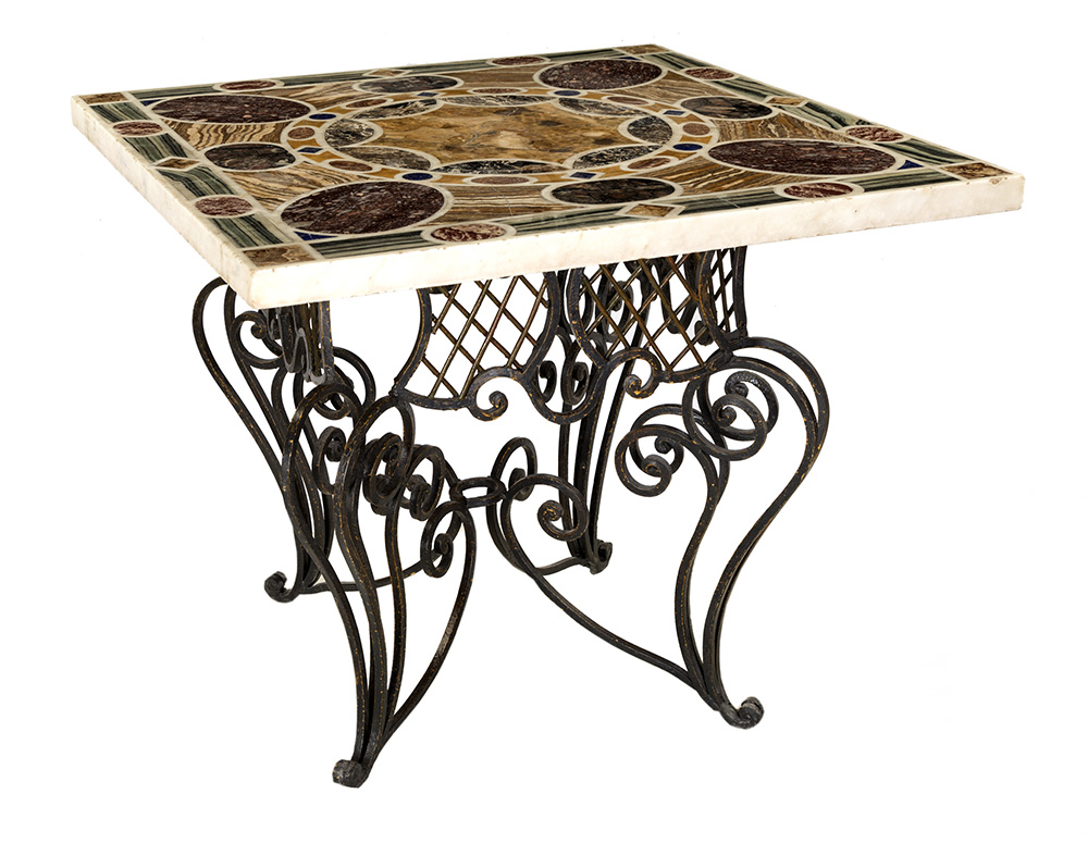 Piano con intarsi di marmo africano, onice, cipollino, bianco e nero di aquitania, semesanto, e vari alabastri cm 92x92