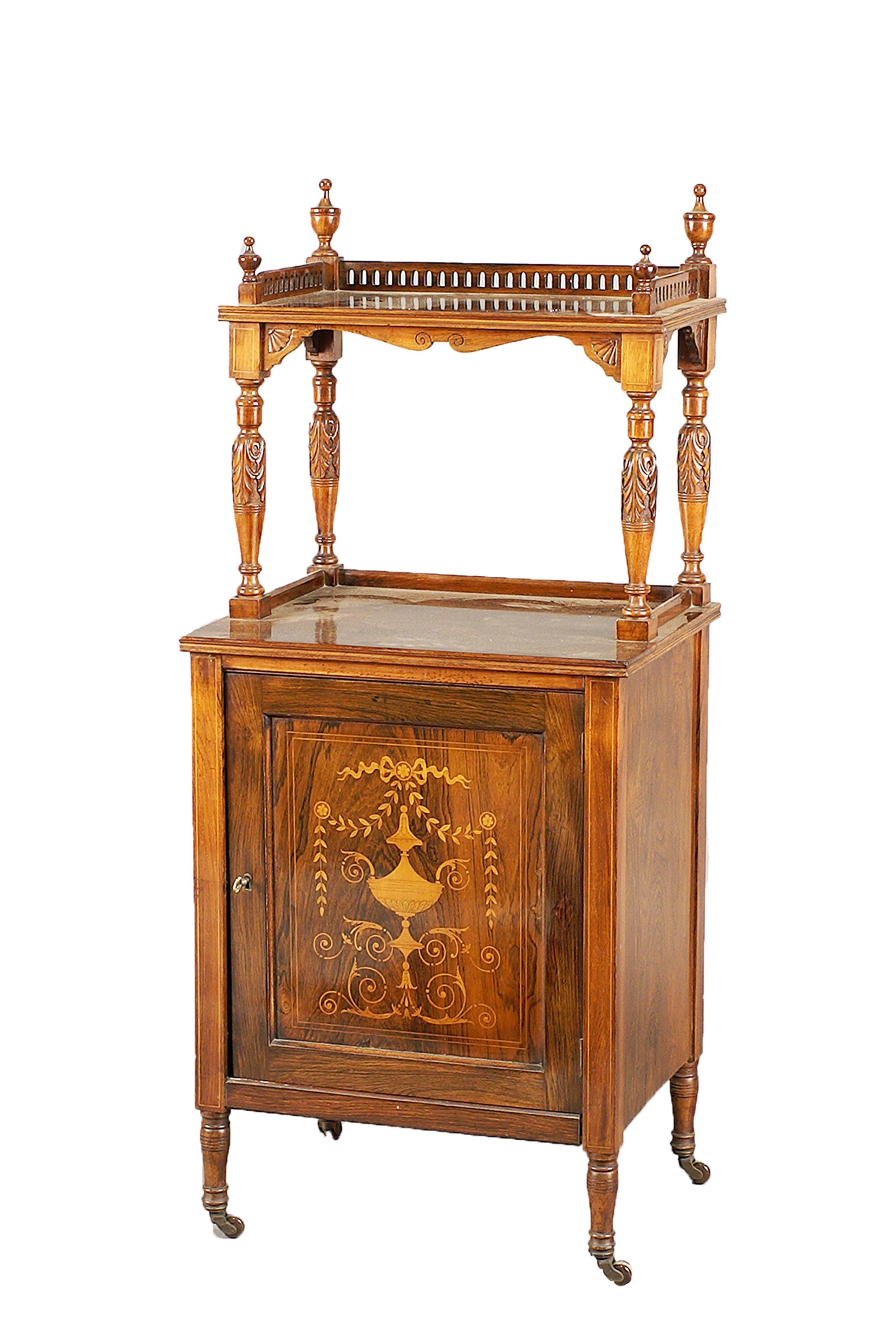 Particolare mobile in palissandro filettato ed intarsiato a due ripiani con uno sportello sottostante, provvisto di rotelle, Inghilterra, fine del XIX secolo, cm. 112x50x38.
