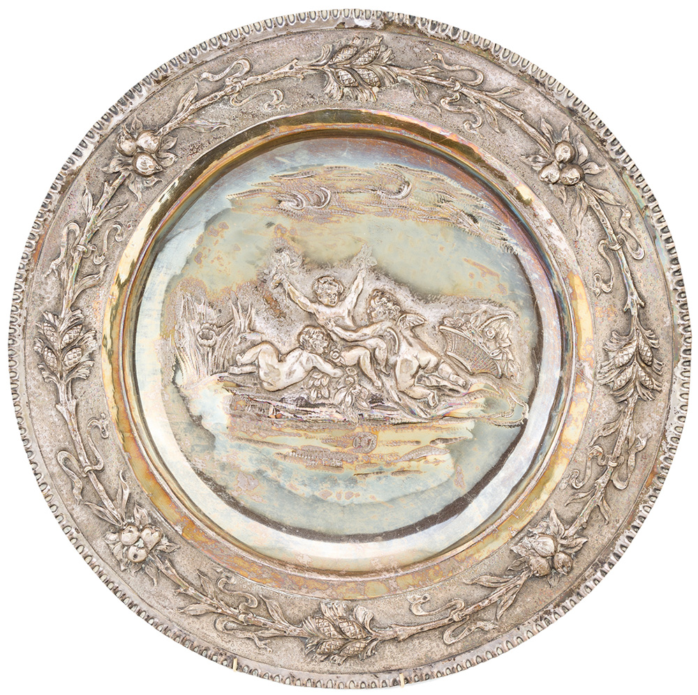Piatto da parata in argento sbalzato g 1052, diametro cm 46