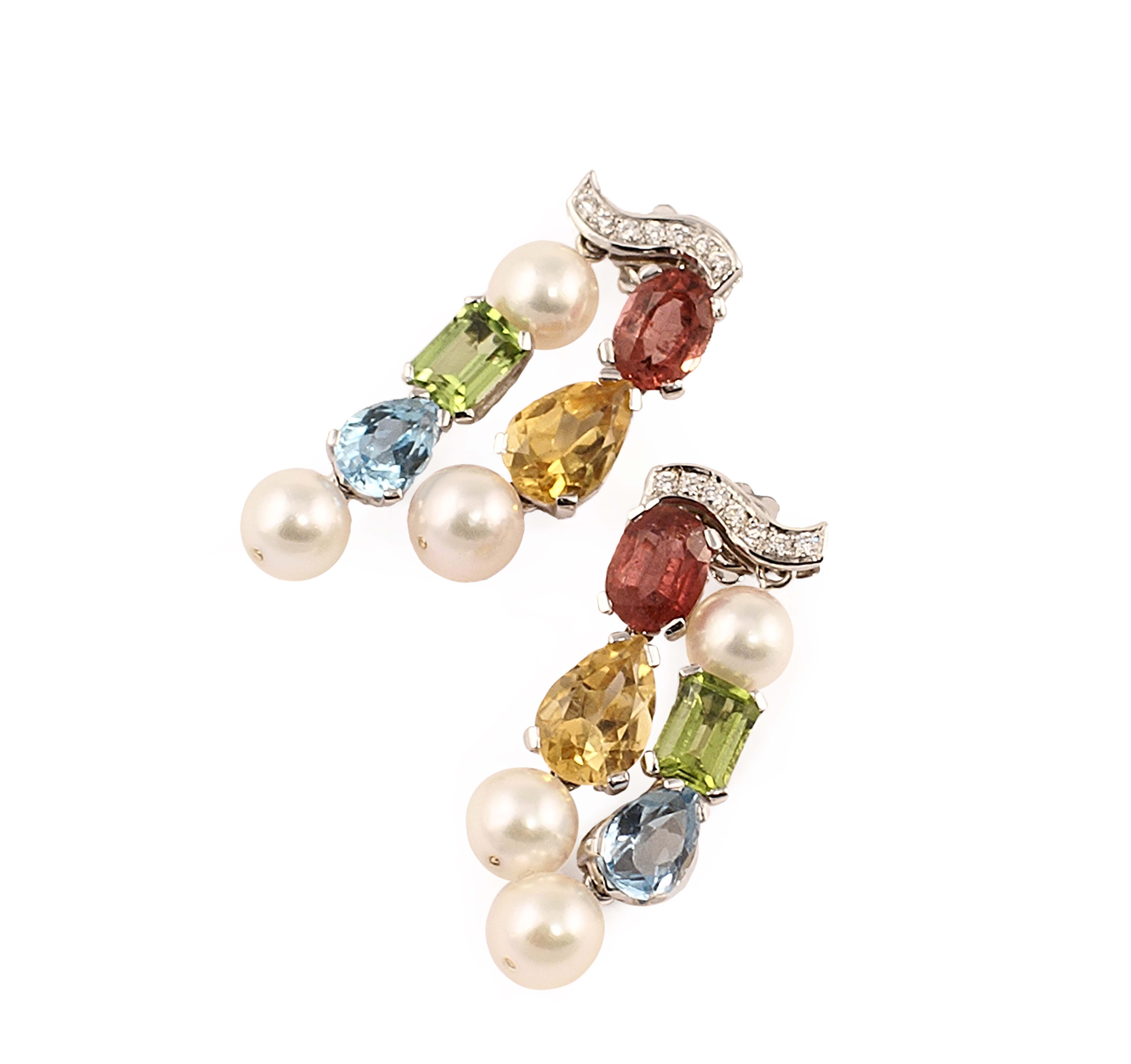 Orecchini pendenti in oro bianco 18kt con incastonate tormaline di diverso colore e taglio per carati 2,98 e diamanti taglio brillante per 0,36 punti circa e quattro perle coltivate di mm. 7 circa, gr. 14,9.